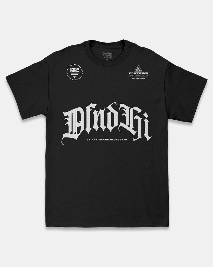 Defend Hawai'i - For the juniors and the OG's, get ready for the Kanak Attack. Featuring a couple shoulder hits and DFND Hi, straight across the ʻōpū. By Any Means Necessary. Pick your favorite color way. This comes in white ink on a black or military green OR black ink on an athletic heather casual-fit tee.