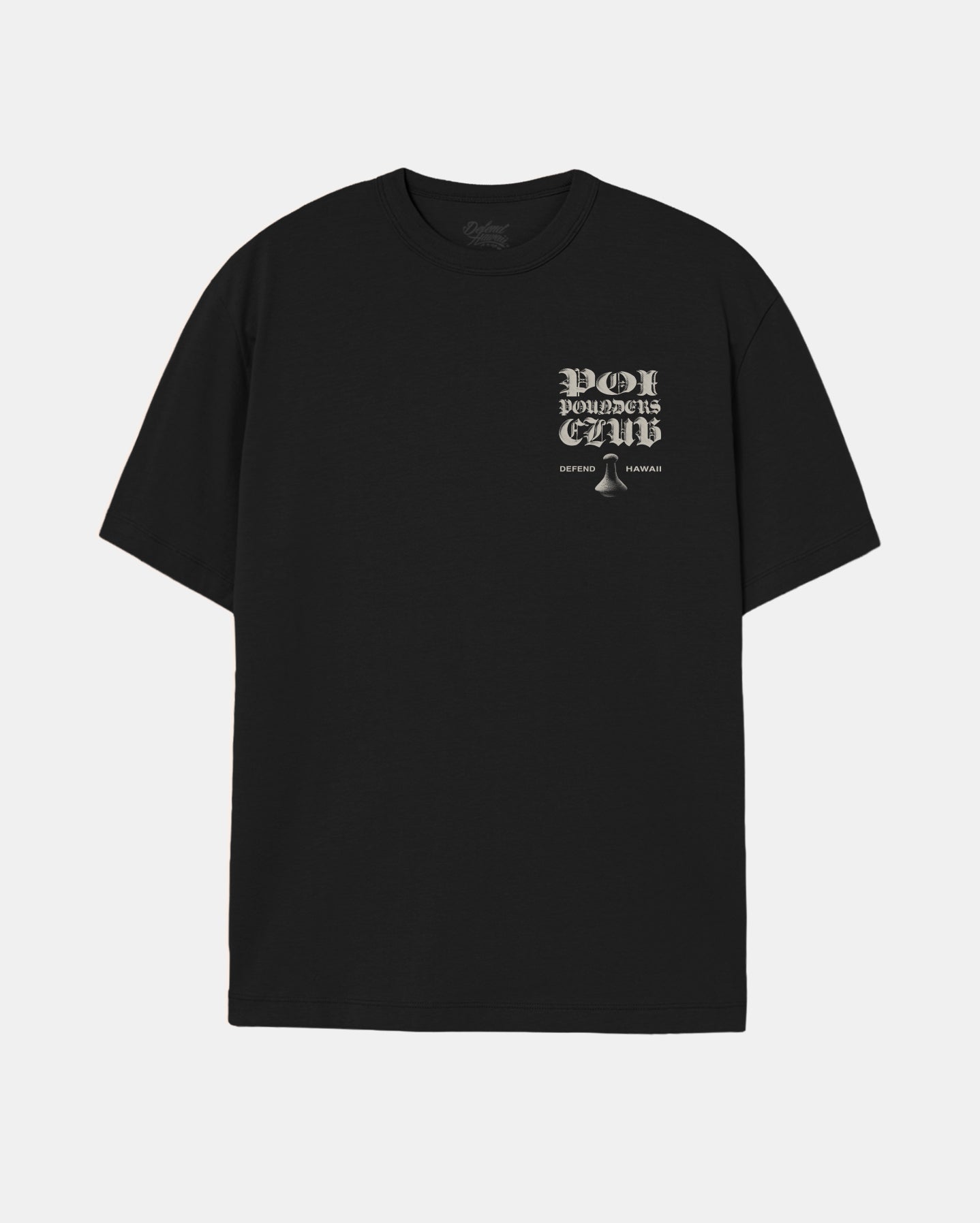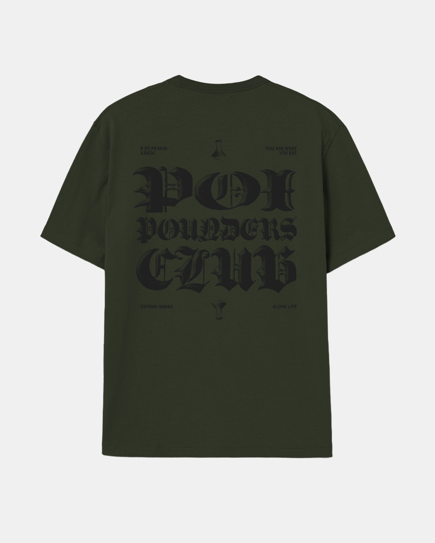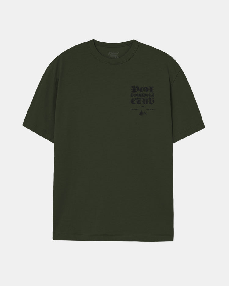 Defend Hawai'i -The first rule of Poi Pounders Club, don't talk about Poi Pounders Club. Featuring a steady pocket hit and roaring back hit. Pick your favorite colorway. This one comes in gray on black or black on military green casual fit t-shirt. Your everyday tee to DEFEND with.