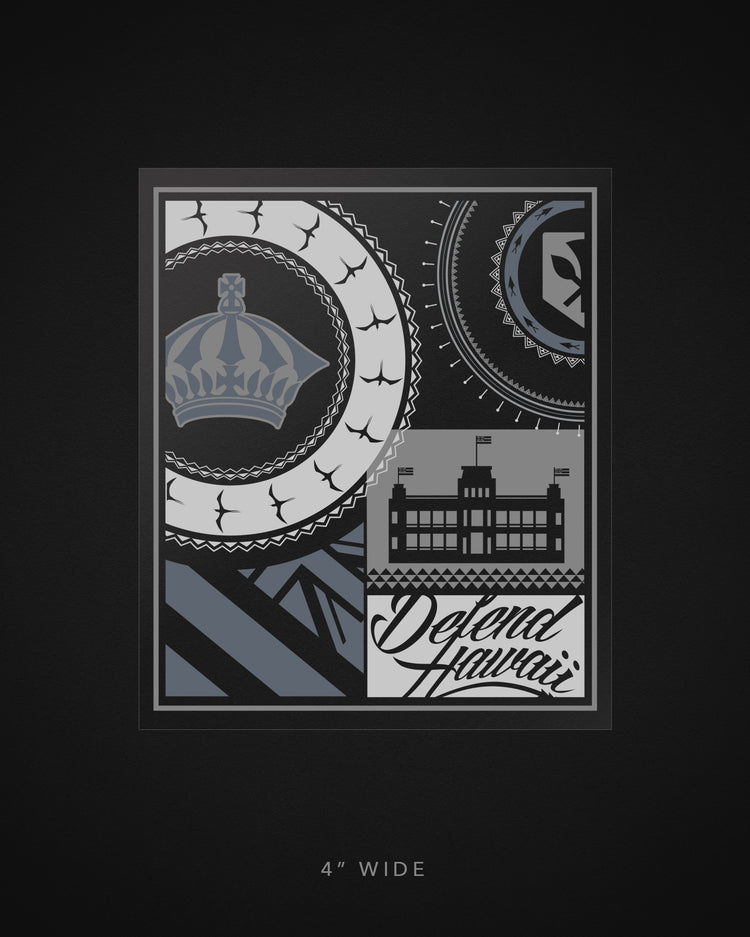 Defend Hawai'i custom die-cut stickers. Collect um, share um, slap um! Cheee! This one is our new Roots Collage in gray ink design! You'll probably just want this for everything.