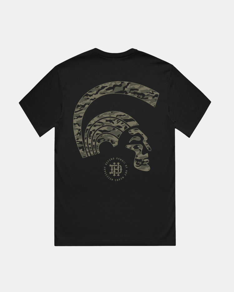 Defend Hawai'i - Huntahz unite, stay blended in our newest Boomski Slik. Featuring an inter locked DH pocket hit, paired with a mayjah boomski head hit on the back, hidden in camo. Pick your favorite color way. This one comes in white and camo ink on a black premium-fit tee.