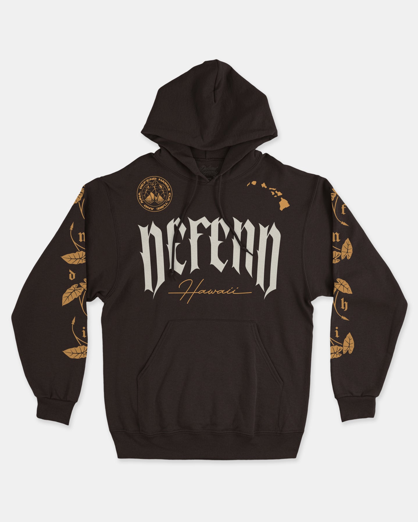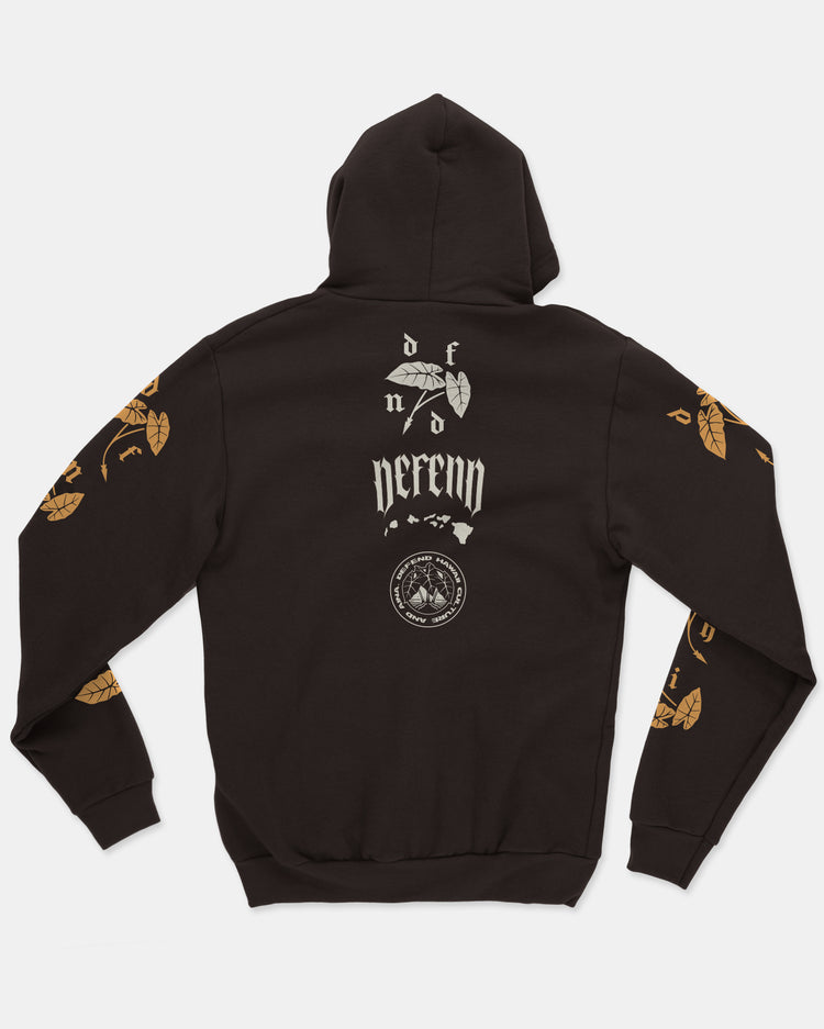 Defend Hawai'i - For those who nourish and make pono use of our natural resources to sustain life in Hawaii and keep our traditions alive. This is for the Kalo Crew. Featuring a wrapped front hit, kalo down the sleeves, and a natural spine hit. Pick your favorite color way. This one is available in cream and gold ink on a brown midweight fleece pullover hoodie.