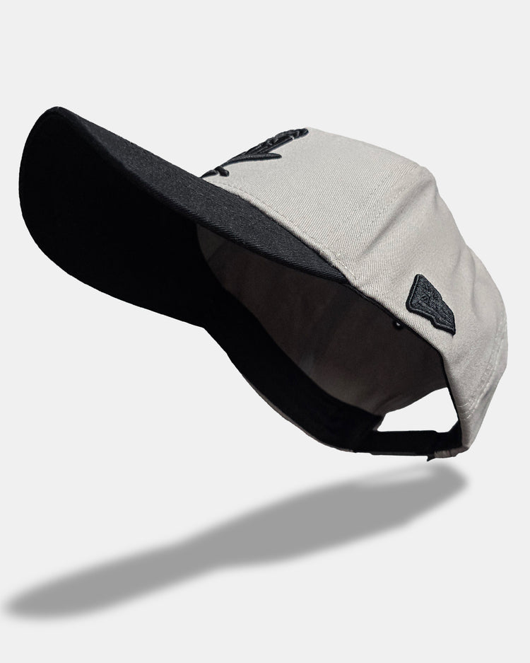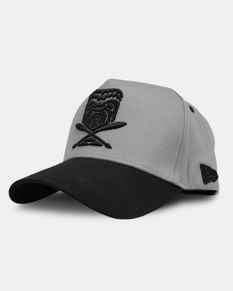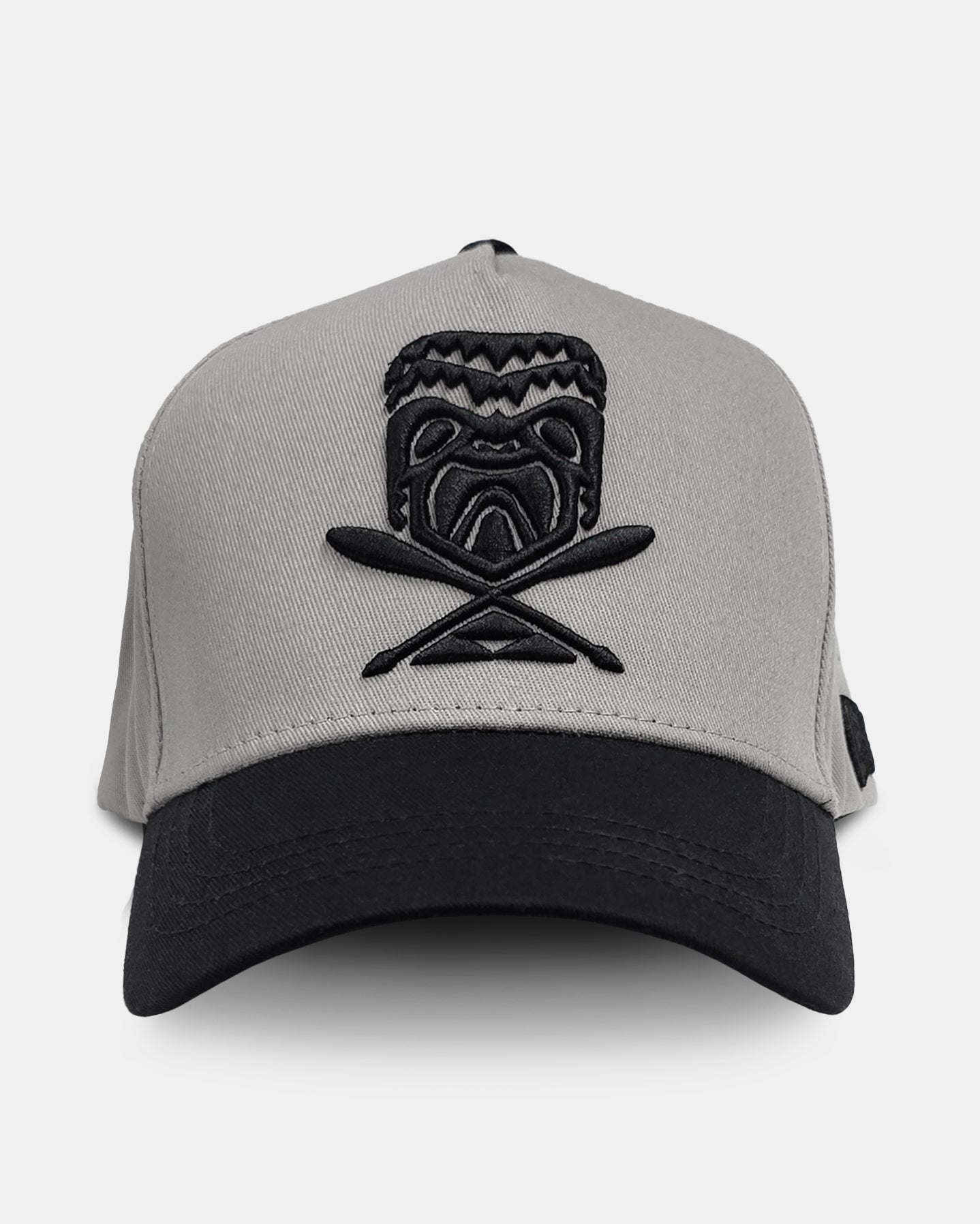 Defend Hawai'i - Our tiki guy stands tall on your crown. The Ki'i  logo embroidered in black on a gray crown hat. A hae Hawai'i (Hawaiian flag) patch embroidered on it's side. This one is a cotton black snapback hat, with a black crown, black eyelets, black brim, and button with a snap closure.