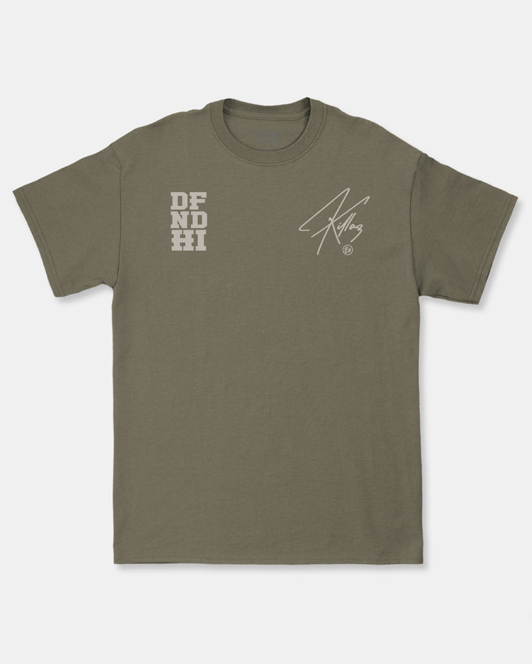 Defend Hawai'i - A new addition to our eradicators saga for da boar huntahz, and an homage to the huntin dogs. This is DFNDHI Killaz. Featuring a double pocket hit and rowdy back hit. Pick your favorite color way. This one comes in gray and natural ink on a black or prairie dust casual-fit tee.