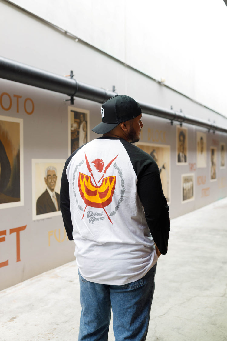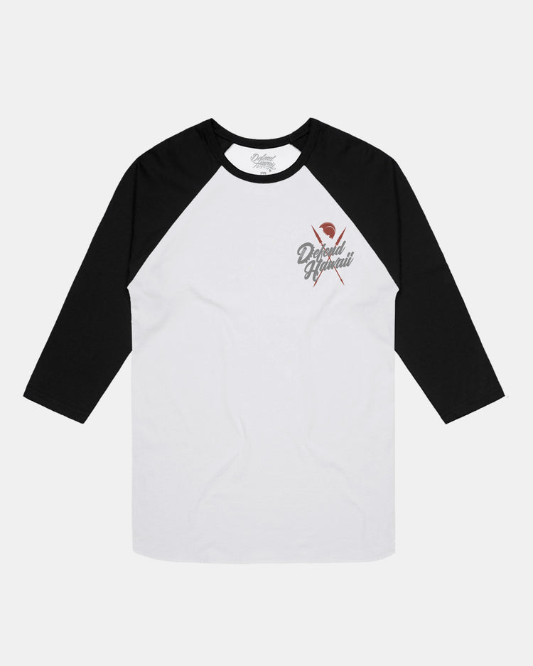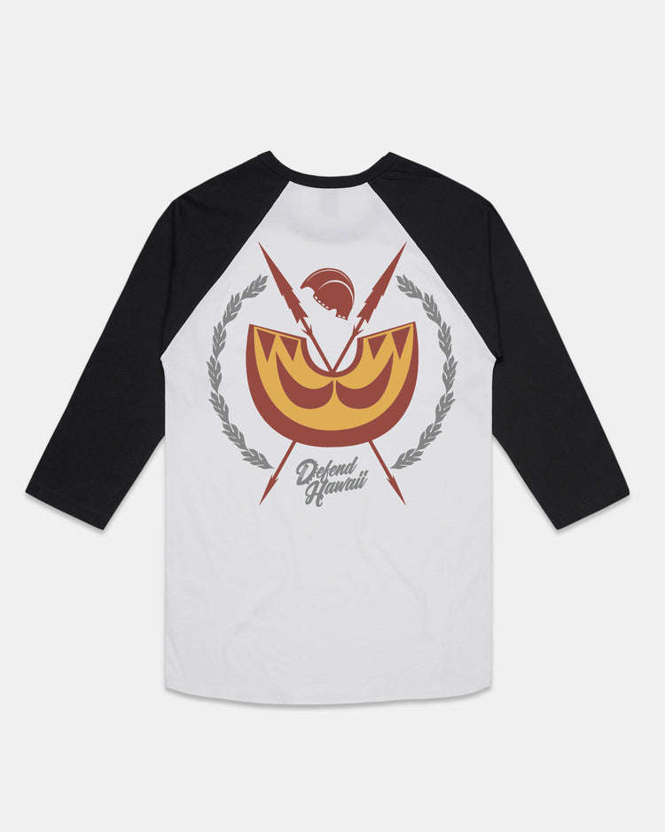 Defend Hawai'i - Armed and ready to defend, this is Ali'i Tings. Shield your chest and back with this double hit tee. Pick your favorite color way, this new installment features a red, yellow, and gray ink design on a black and white 3/4 sleeve raglan.