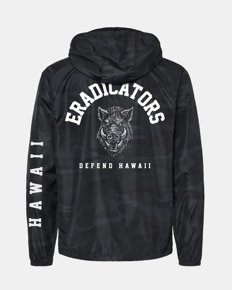Defend Hawai'i - A new addition to our eradicators sage, our pua'a 'ahiu shap is back for da boar huntahz. Featuring a pocket hit and mayjah back hit. Pick your favorite color way. This one comes in white ink on a black camo nylon windbreaker.