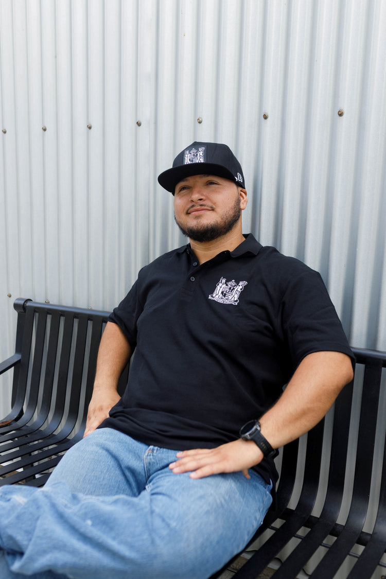 Defend Hawai'i - To loudly and proudly wear HI On My Shoulders. Featuring the respected crest pocket hit and home big and bold on the back. Pick your favorite color way. This one comes in off white ink on a black polo.