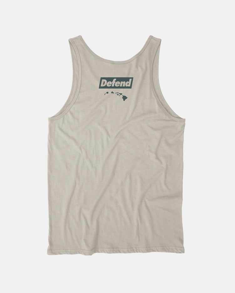 Defend Hawai'i - Hiding in plain Kalo sight, this is Kaloflage. Featuring a simple center and flourishing back hit. Pick your favorite color way. This one comes in green and gray ink on a tan casual fit tank top.