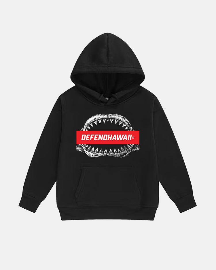 Defend Hawai'i -An on the ground parody. Get a mouth ful. This is Manoground. Featuring a raoring front hit. This one comes in red and white ink on a black midweight fleece pullover kids hoodie. Your everyday tee to DEFEND with.