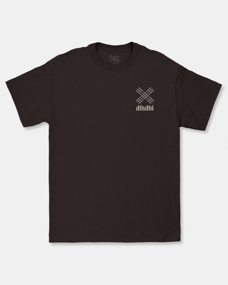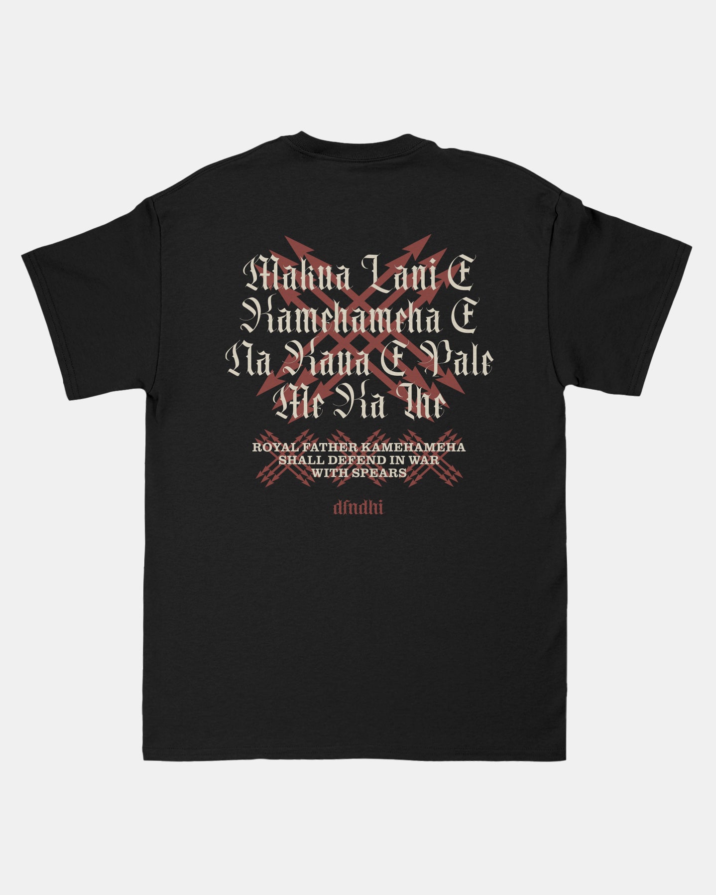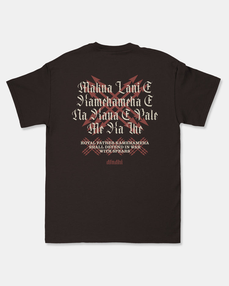 Defend Hawai'i - Introducing Me Ka Ihe- "Royal Father Kamehameha shall defend in war with spears". Featuring a spear pocket hit and a sharp back hit. Pick your favorite colorway, this one comes in sand and red on black OR sand and gray ink on a brown casual fit t-shirt. Your everyday tee to DEFEND with.