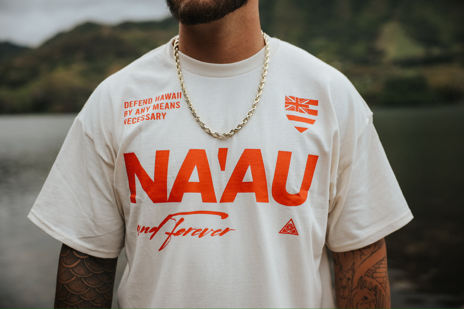 Defend Hawai'i - A reminder to everyone, we are Na'au and Forever. This is a tribute to old, current, and the future of Hawai'i. Pick your favorite colorway, this one comes in black and red ink on natural OR white and red ink on a black casual-fit tee.