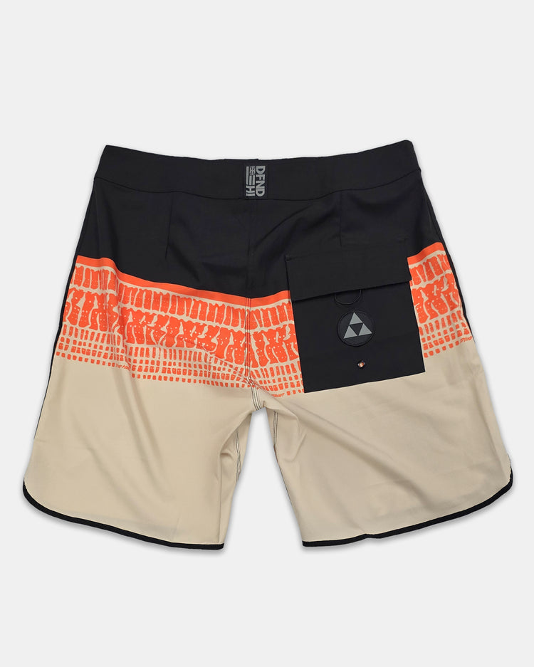 Defend Hawai'i releases our new Pupu Miter boardshort design. Stand proudly in our orange and natural pupu boardshort, bordered by a bold black trim.
