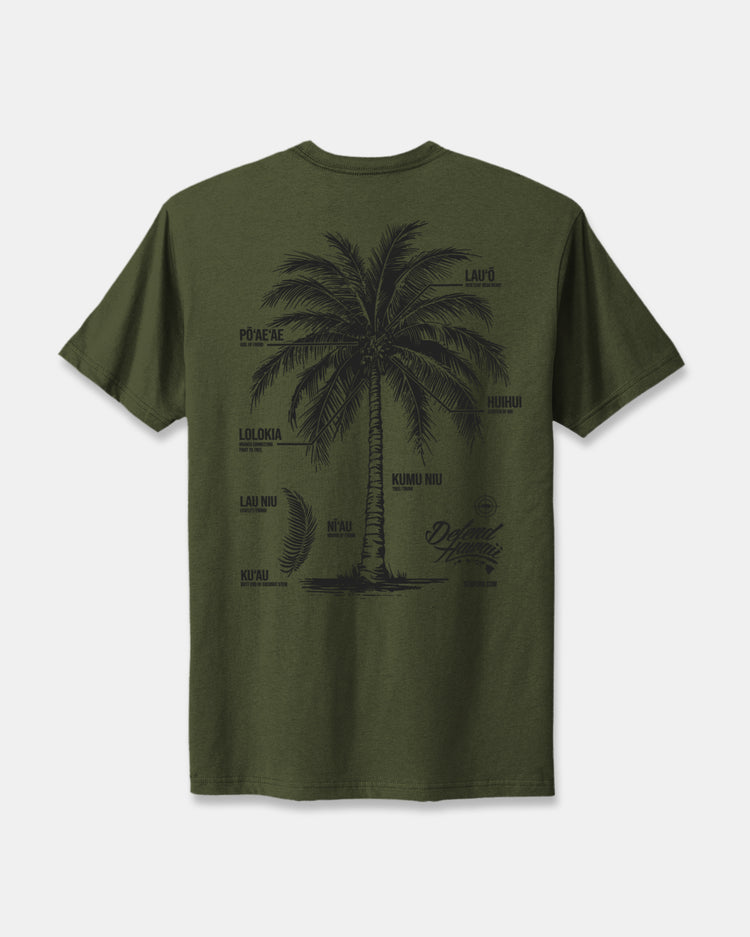 Defend Hawai'i - Defend Hawaii Niu. A small reminder that pono use of our natural resources is key to sustaining life in Hawai'i. This one is for the 'aina driven people looking to make a statement. This one comes in black ink on a military green premium-fit tee.