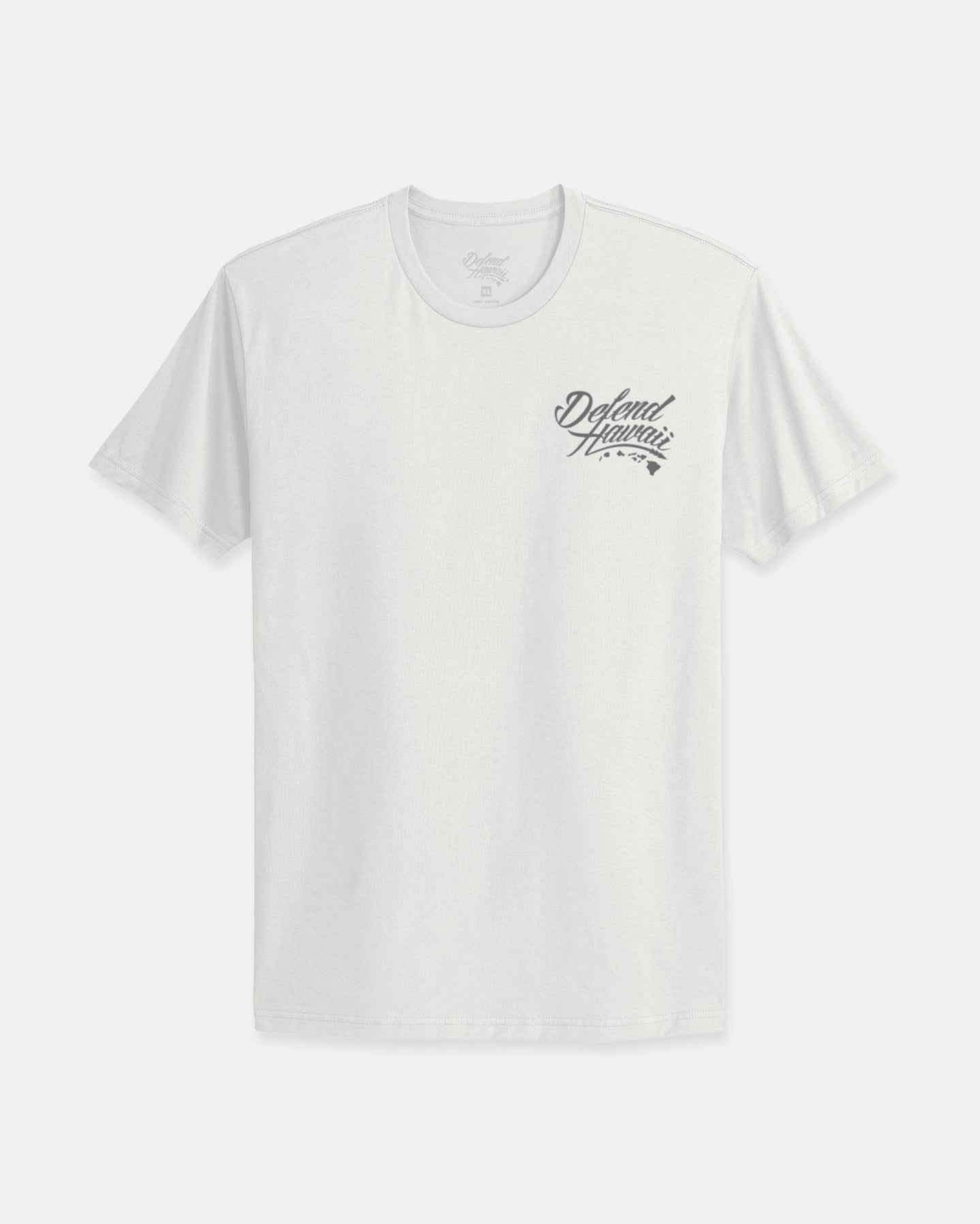 Defend Hawai'i - The iconic, never duplicated, stapled Wildstyle 'Elua logo. Featuring a subtle pocket hit paired with a mayjah back hit in a clean, simple color. This one comes in gray ink on a white premiumfit t-shirt. Your everyday tee to DEFEND with.
