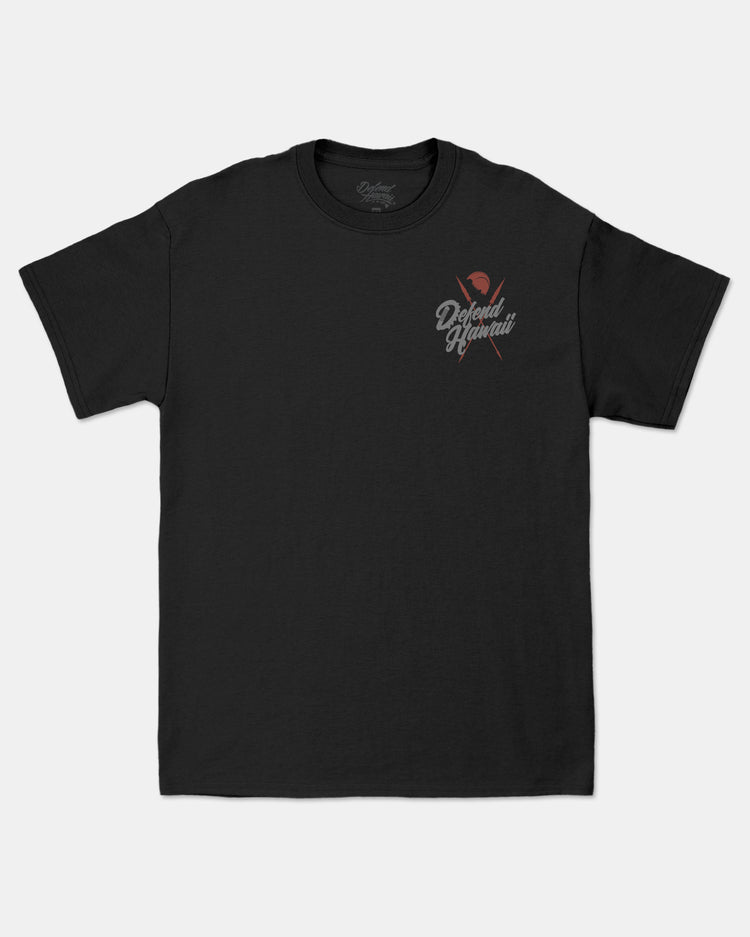 Defend Hawai'i - Armed and ready to defend, this is Ali'i Tings. Shield your chest and back with this double hit tee. Pick your favorite color way, this new installment features a red, yellow, and gray ink design on a black or white casual-fit tee.