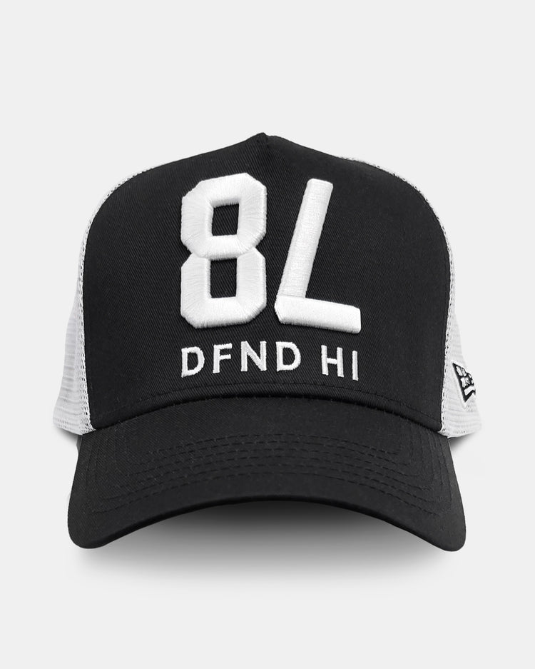 Defend Hawai'i - Our newest headwear drop featuring our Cultural Damage logo embroidered in white on a black a-frame trucker. This one is a cotton casual fit hat, with a black crown, black eyelets, black brim, and button with a snap closure.