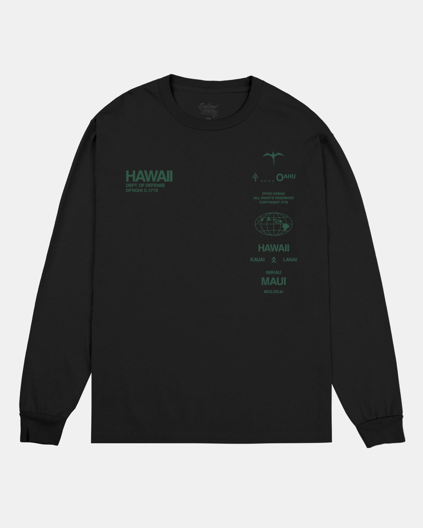 Defend Hawai'i -Property of the Department of Defense. Featuring a double chest hit. This one comes in green ink on a black or medium gray casual fit t-shirt. Your everyday tee to DEFEND with.