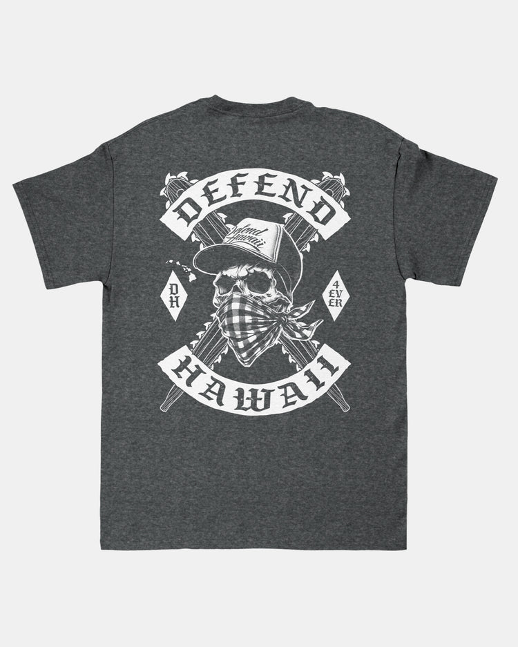 Defend Hawai'i - Not new to it, but true to it. This is DH 4Eva. Featuring a logo pocket hit and a large skull cap back hit, this time with a palaka bandana. Pick your favorite color way. This one comes in white ink on an black or charcoal heather casual-fit tee.