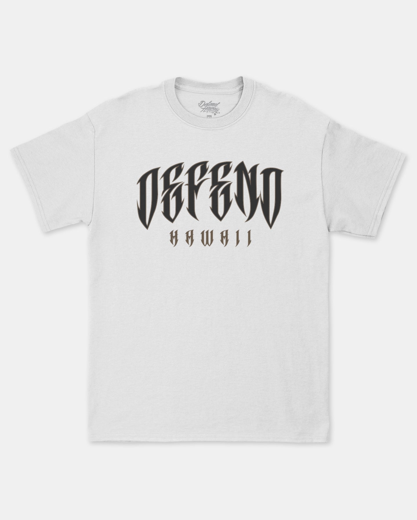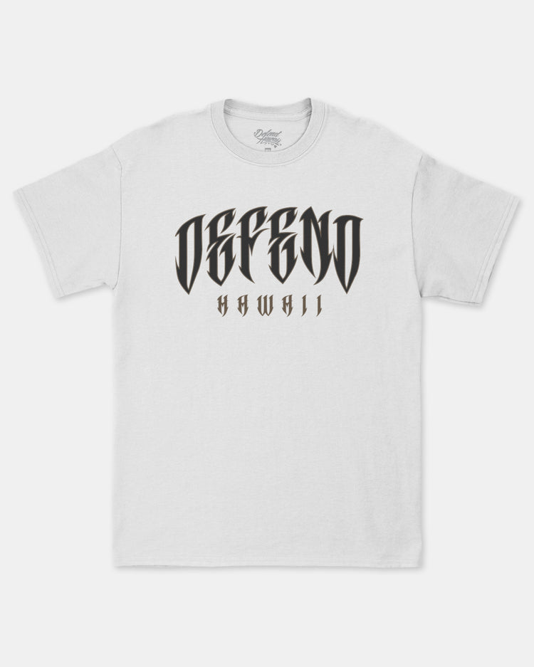 Defend Hawai'i - Watch your fingers, this is Sharp. A clean tee with a sharp font. Featuring a chest hit and a skully ASL spine hit, because our mission translates everywhere. Pick your favorite color way. This one comes in white on black or black on white casual-fit tee.