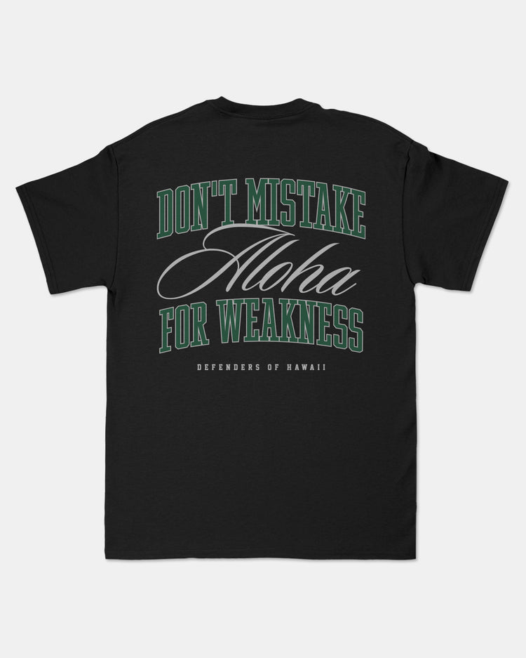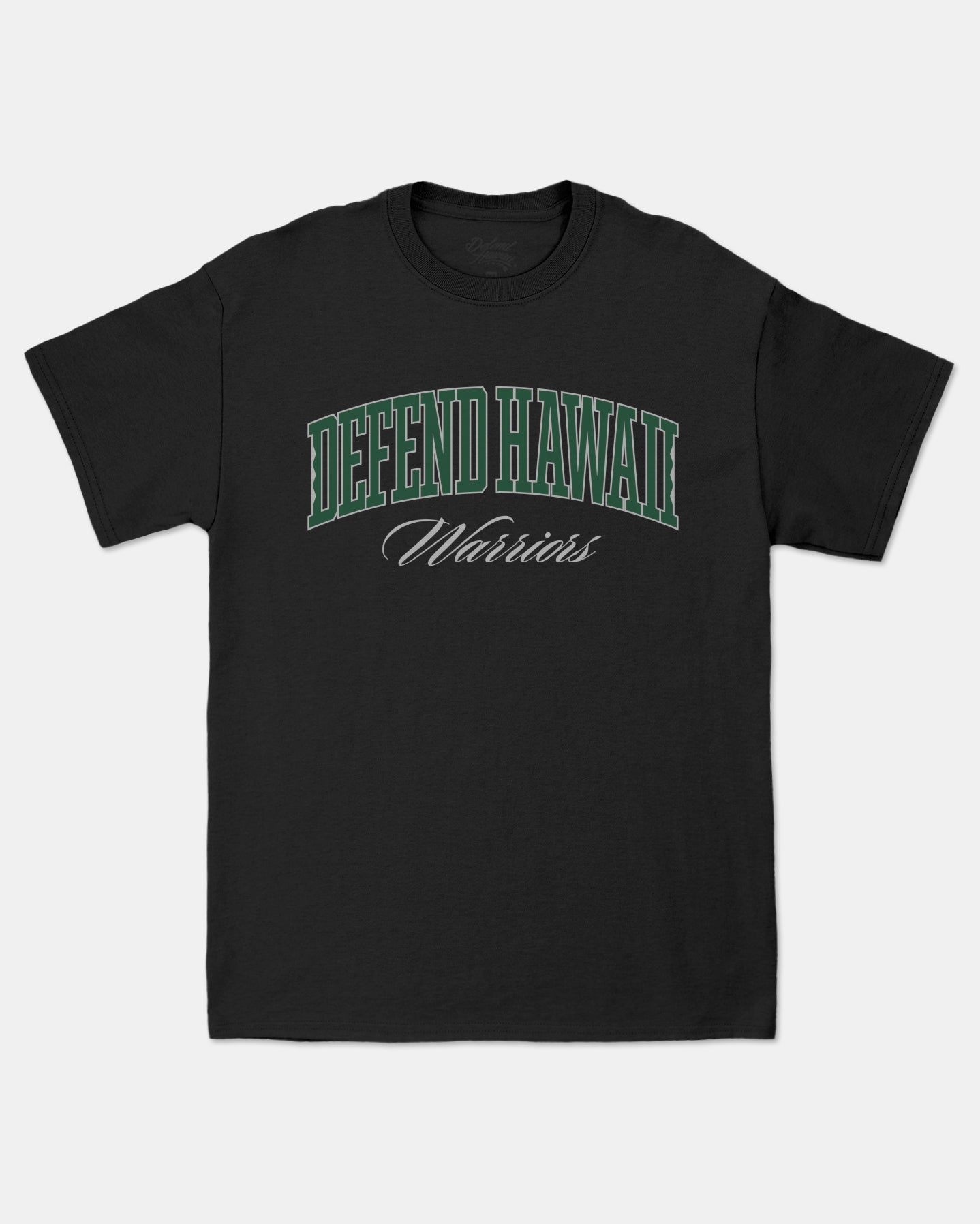 Defend Hawai'i x Rainbow Warrior Defense is back and bolder!  In support of our Home Team defenders, the football defense, and Coach CB, Defend Hawai'i will be donating a portion of the proceeds for each collab product purchased to the UH Football Program. With this one, you get white and green ink printed on a black or prairie dust regular fit tee.  This design is also available in a premium tee and a dri-fit hoodie.