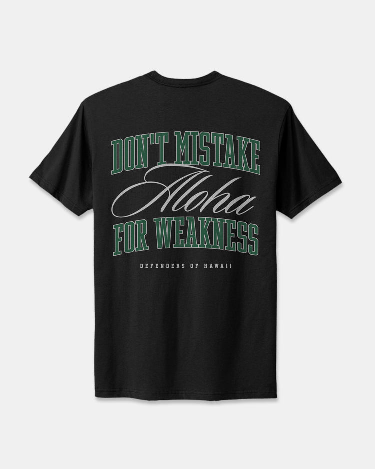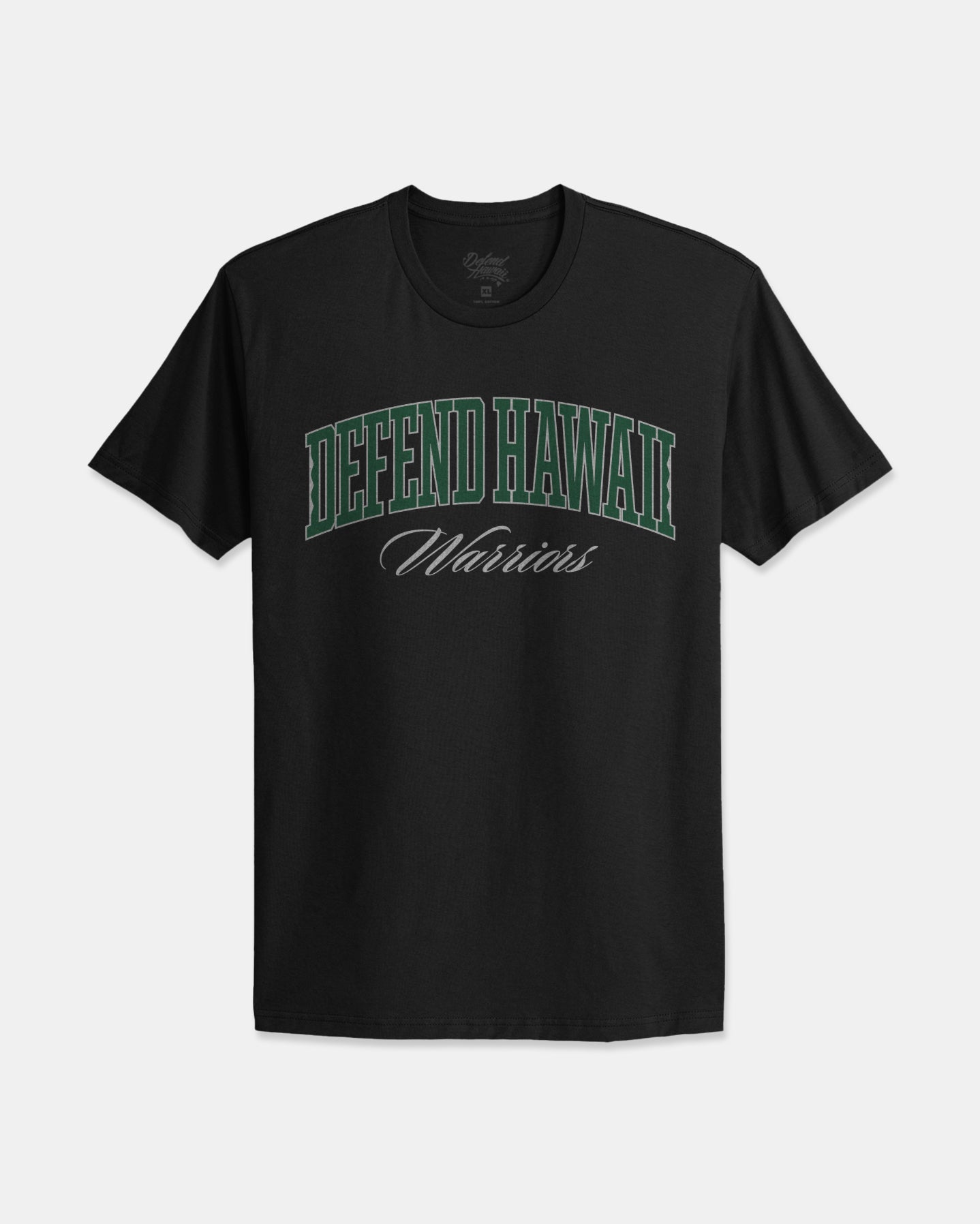 Defend Hawai'i x Rainbow Warrior Defense is back and bolder!  In support of our Home Team defenders, the football defense, and Coach CB, Defend Hawai'i will be donating a portion of the proceeds for each collab product purchased to the UH Football Program. With this one, you get white and green ink printed on a black premium fit tee.  This design is also available in a premium tee and a dri-fit hoodie.