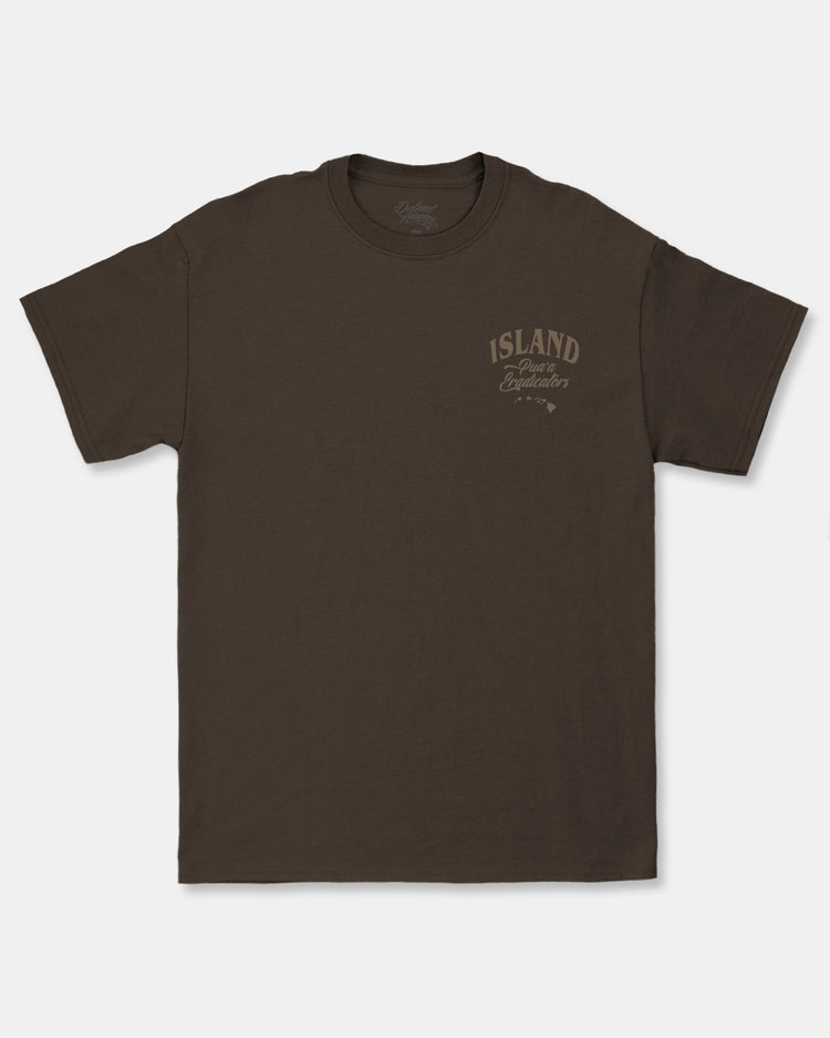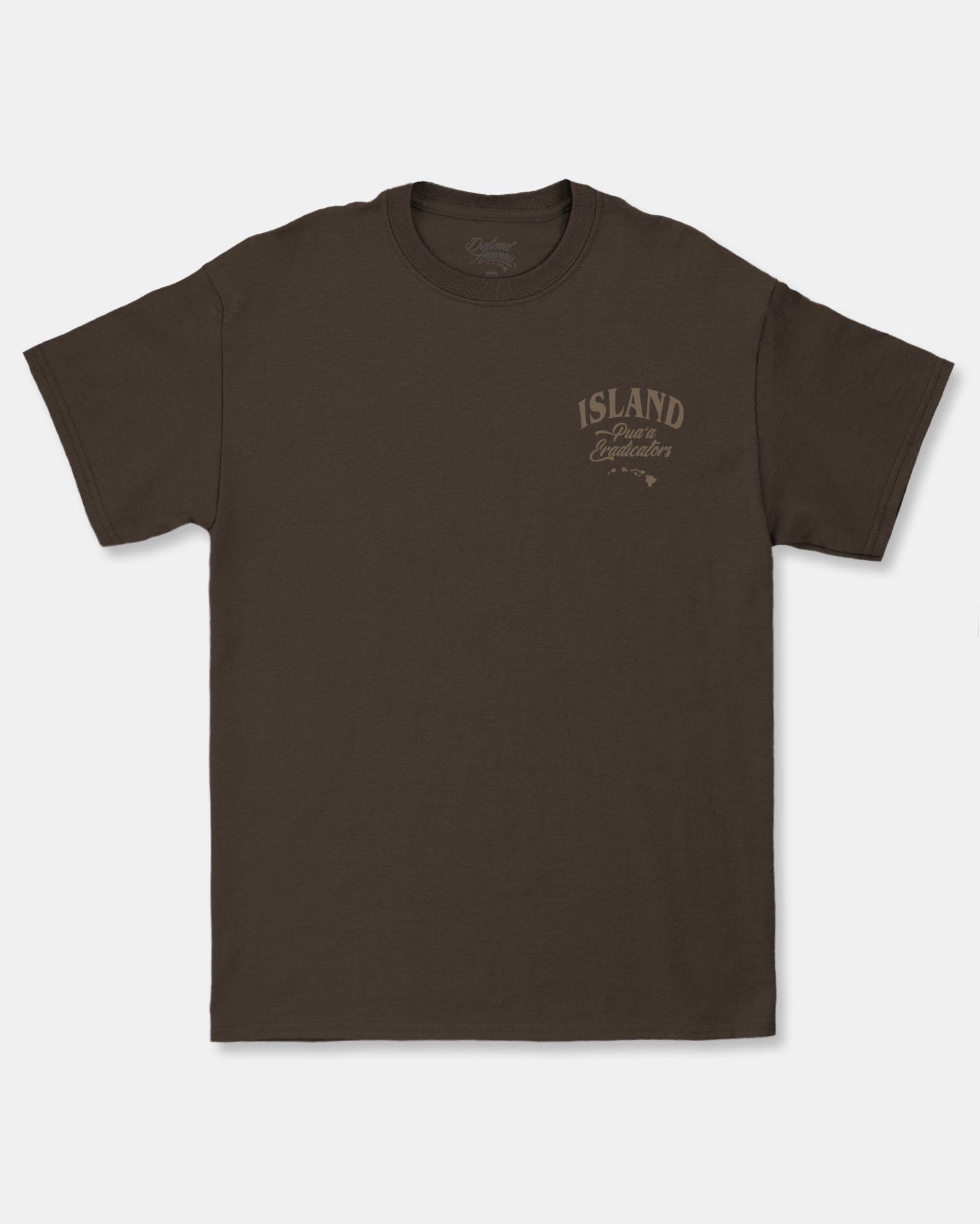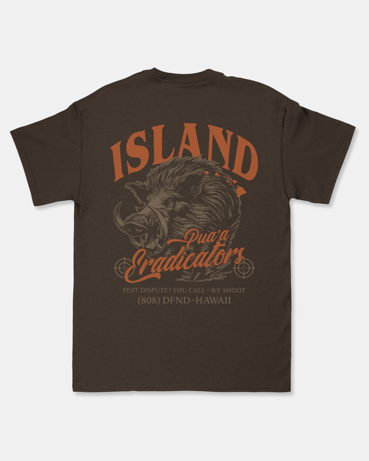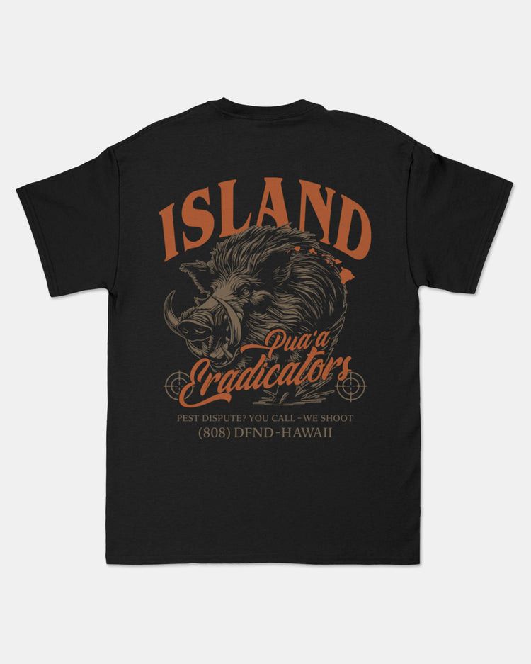 Defend Hawai'i - A new addition to our eradicators sage, our pua'a 'ahiu shap is back for da boar huntahz. Pest dispute? You call-we answer. Featuring a pocket hit and mayjah back hit. Pick your favorite color way. This one comes in orange and tan ink on a black or brown casual-fit tee.