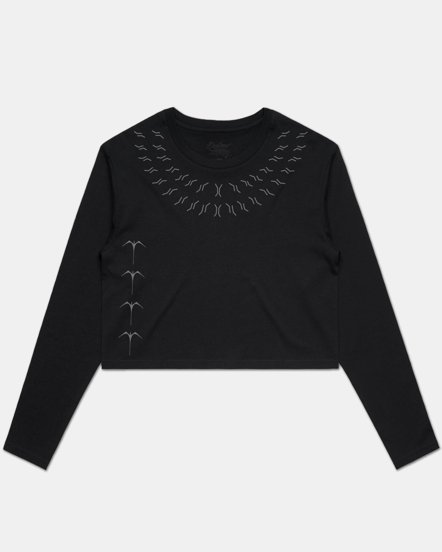 Defend Hawai'i - Wear your lei all day, this one is a bit different, the Kakau Lei. This one comes with freshly inked gray printed on black cropped longsleeve. Your everyday tee to DEFEND with.