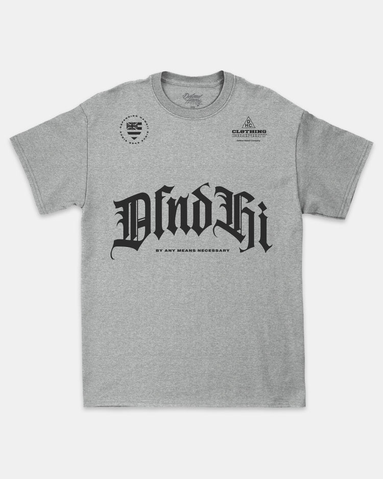 Defend Hawai'i - For the juniors and the OG's, get ready for the Kanak Attack. Featuring a couple shoulder hits and DFND Hi, straight across the ʻōpū. By Any Means Necessary. Pick your favorite color way. This comes in white ink on military green OR black ink on an athletic heather premium-fit tee.