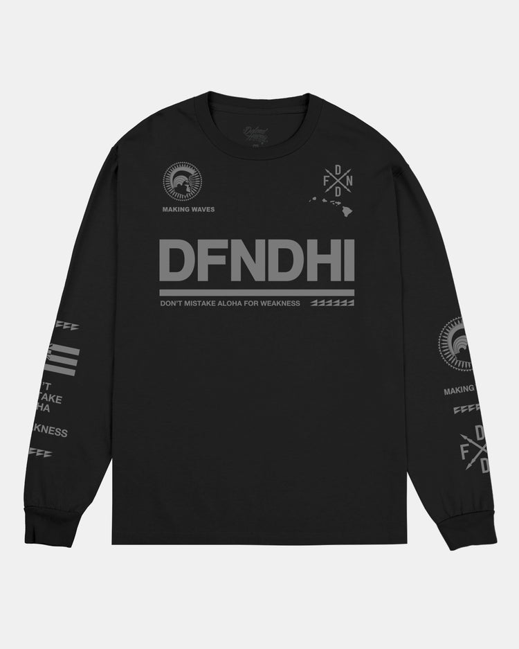Defend Hawai'i - One of our classic heavy hitter designs remastered as the new Making Waves '26. Featuring the og mayjah front hit and doublle sleeve hits. Pick your favorite color way, this one comes in light gray ink on black or military green long sleeve.