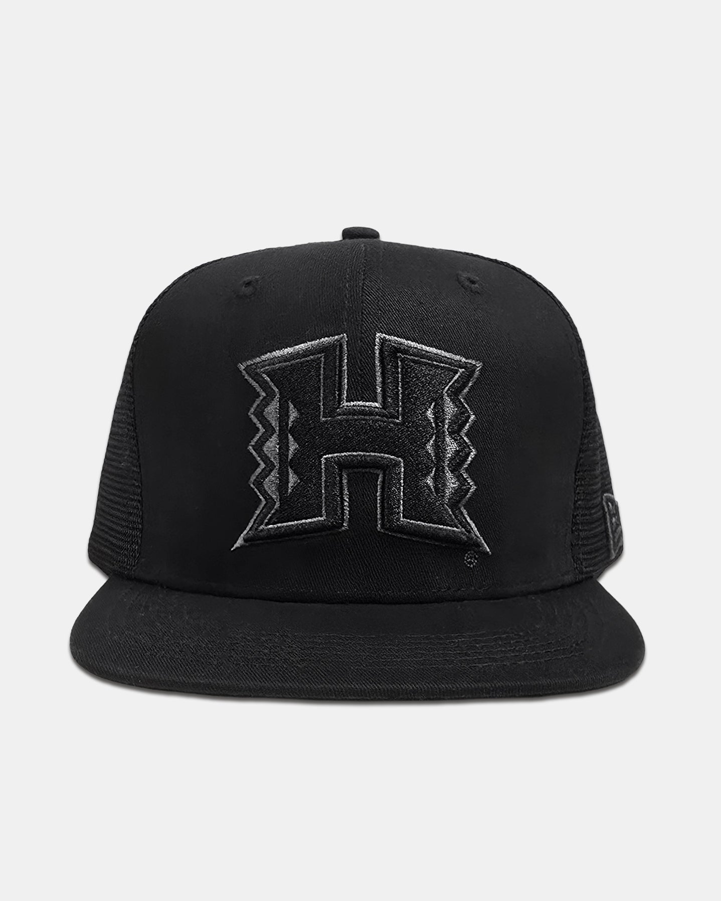 This one comes in a black embroidery on black cotton meshback snapback. A hae Hawai'i (Hawaiian flag) patch embroidered on it's side. This one is a cotton a-frame snapback hat, with a black crown, black eyelets, black brim, and button with a snap closure.