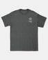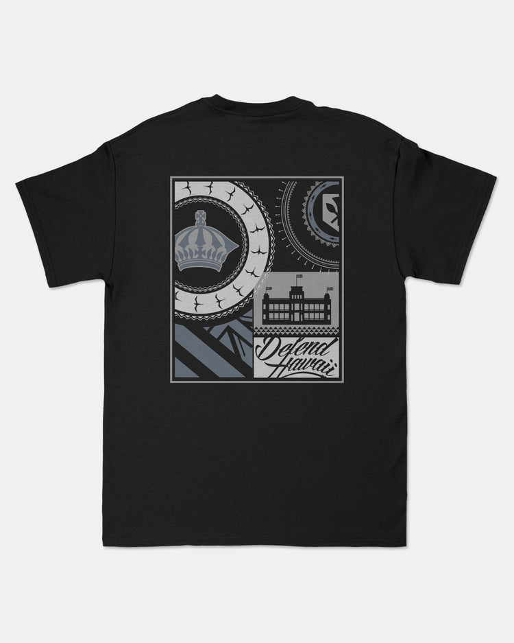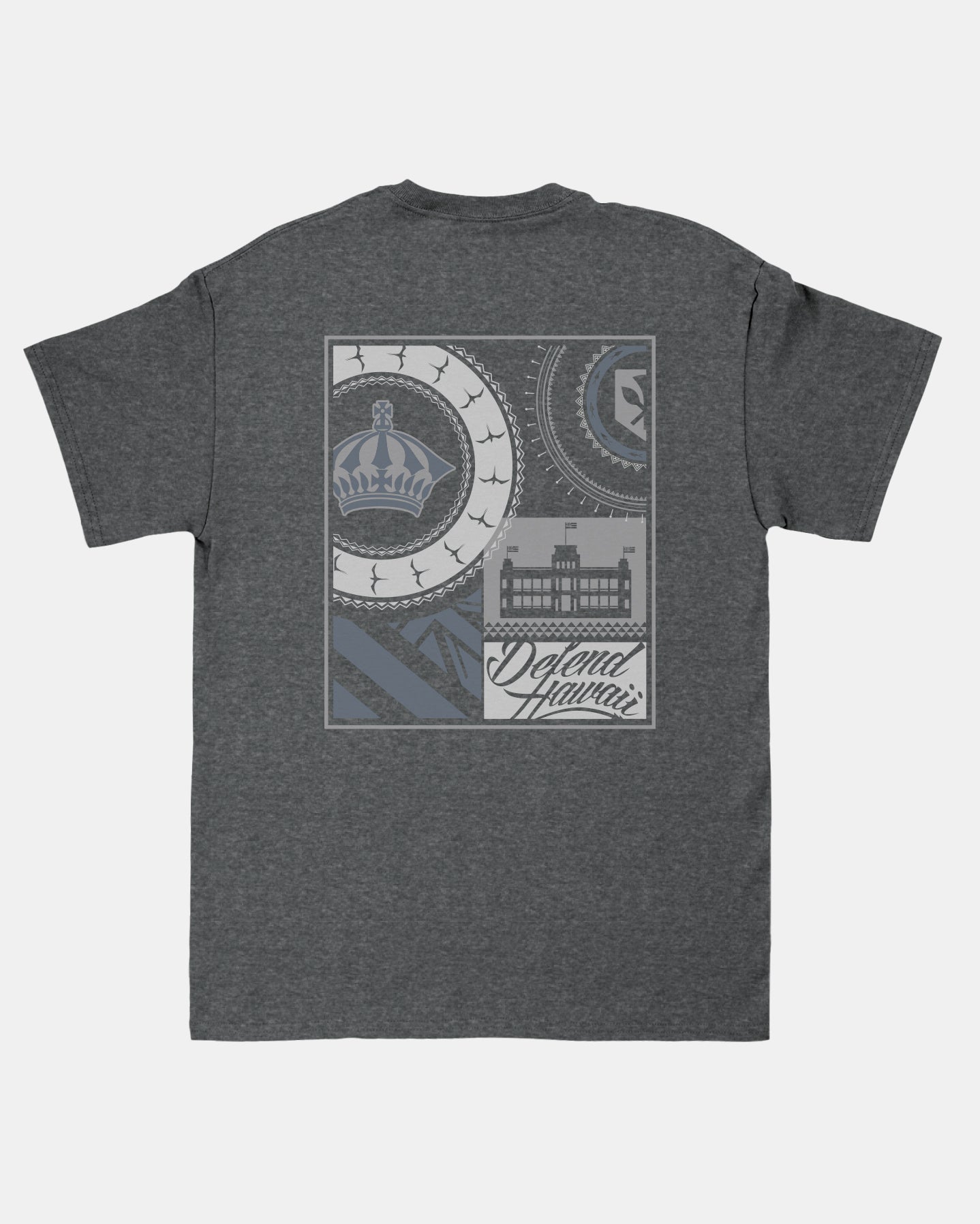 Defend Hawai'i - From the beginning, from our roots.  This collage tells a story. This is Roots Collage '25. Featuring a double logo pocket hit and a collage square back hit. Pick your favorite color way. This one comes in stone blue and gray ink on black or charoal heather casual fit t-shirt.