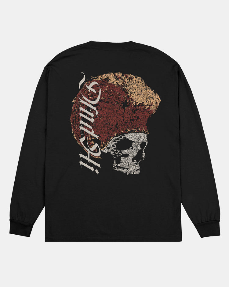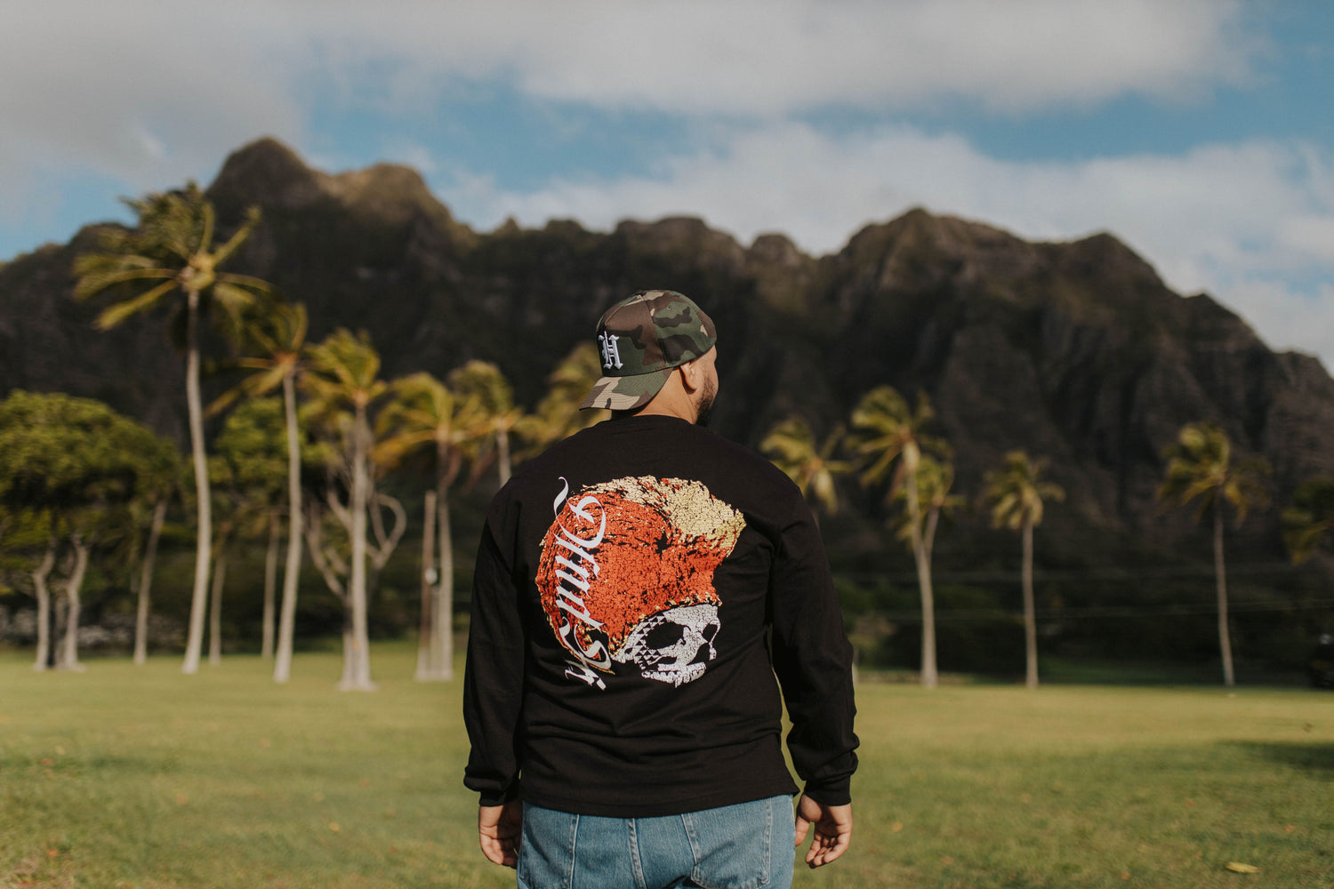 Defend Hawai'i - There's something about the Ali'i Po'o that always gives you a sense of pride. This time as a Skulii Po'o on a clean pocket hit and roaring back hit. Pick your favorite colorway. This one comes in white, red, and gold ink on a black casual fit long sleeve. Your everyday tee to DEFEND with.