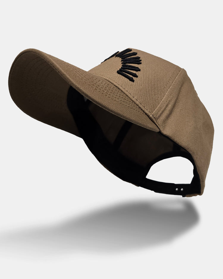 Defend Hawai‘i - A classic look to sit proudly on your crown. The Sunset a-frame snapback. Embroidered in black on a tan a-frame snapback. This one is a tan cotton snapback hat, with a tan crown, tan eyelets, tan brim, and button with a snap closure.