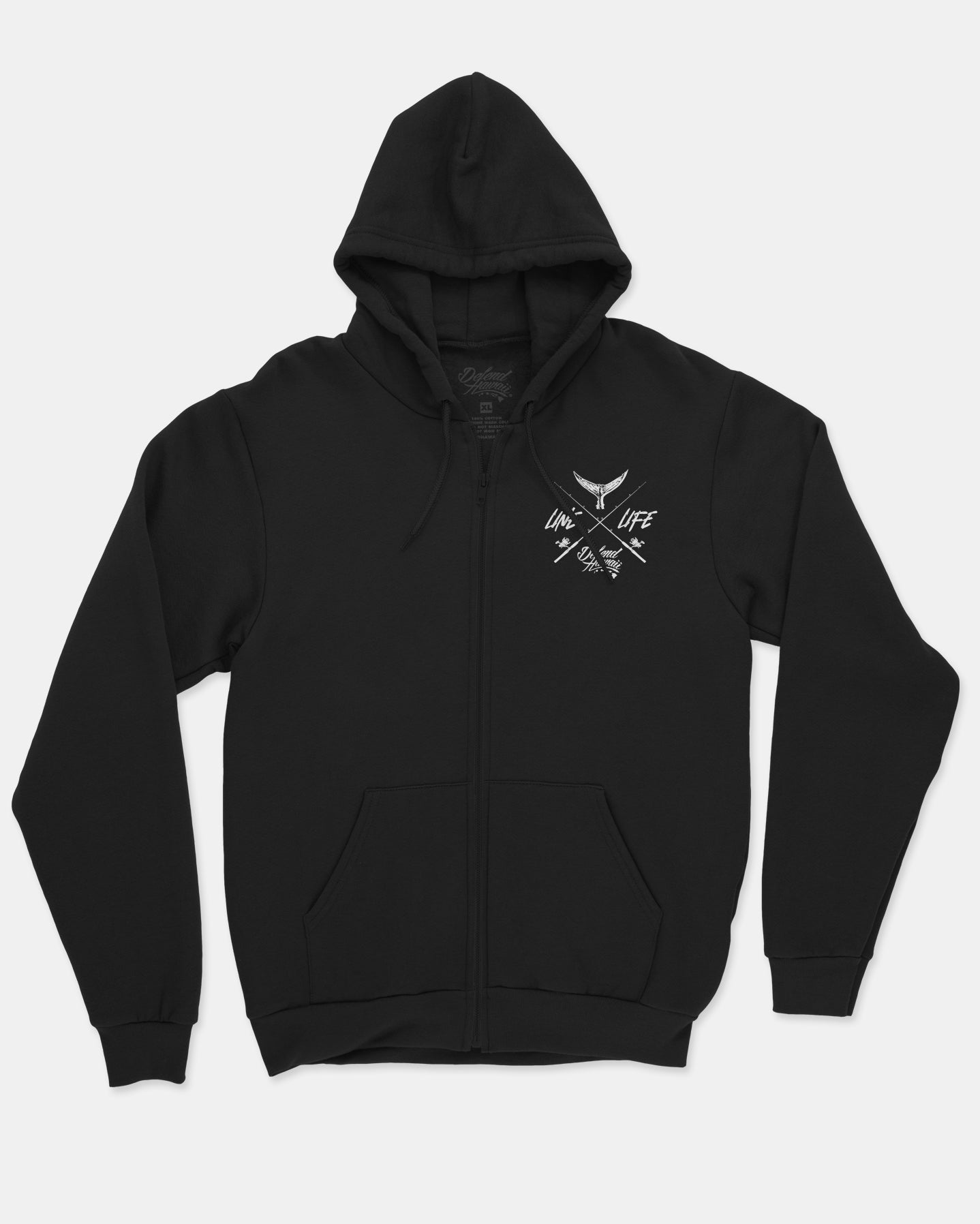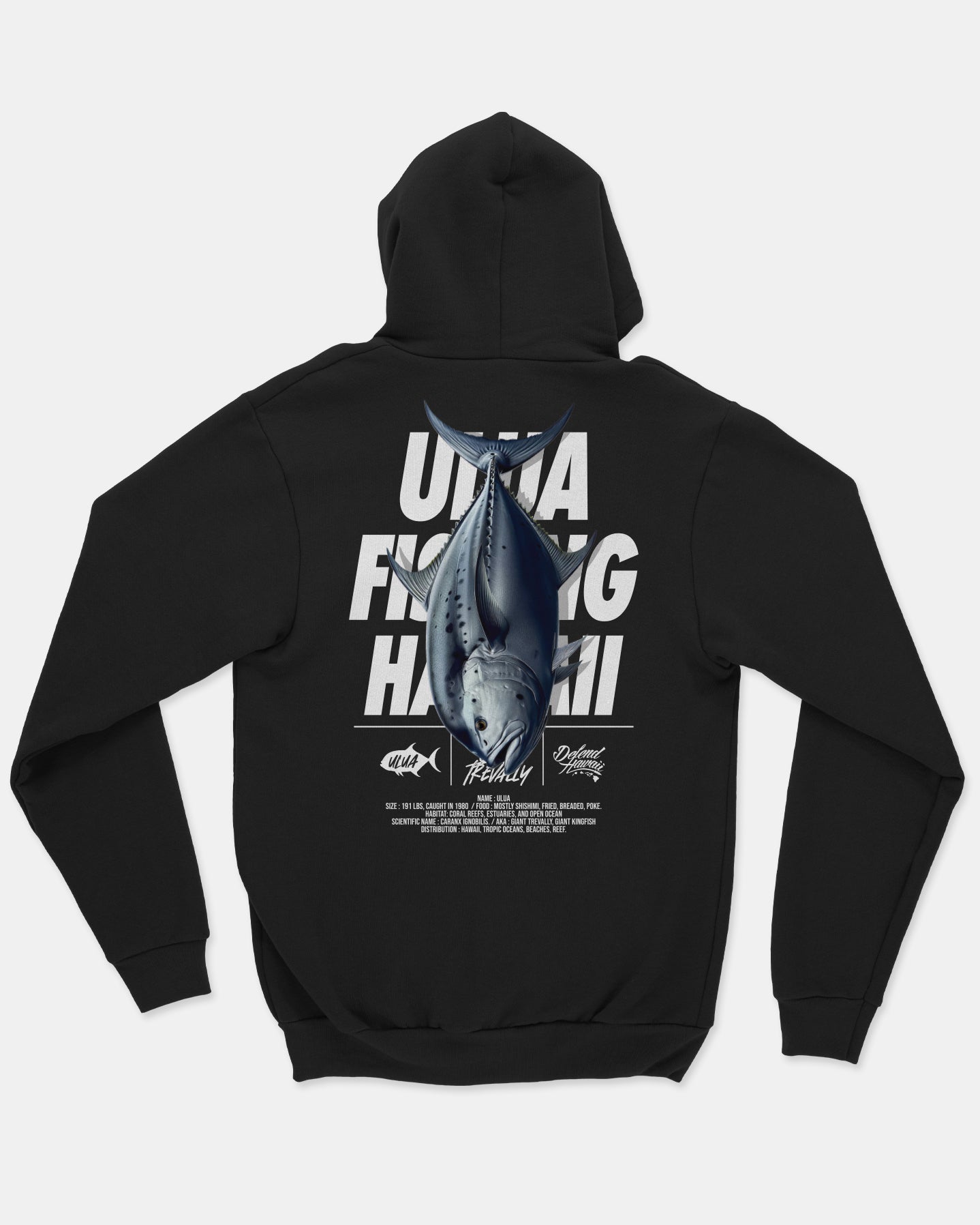 Defend Hawai'i - Fresh fish, sold by the pound. Ulua Hangahz, featuring a clean Line Life pocket hit and an ulua bangah of a back hit. This one is available in white and blue ink on a black midweight fleece zip hoodie.