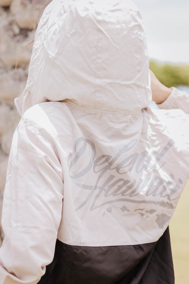 Defend Hawai'i - The iconic, never duplicated, stapled Wildstyle 'Elua logo. Featuring a subtle pocket hit paired with a mayjah back hit in a clean, simple color. This one comes in gray ink on a 2-tone gray nylon anorak windbreaker. Your everyday jacket to DEFEND with.