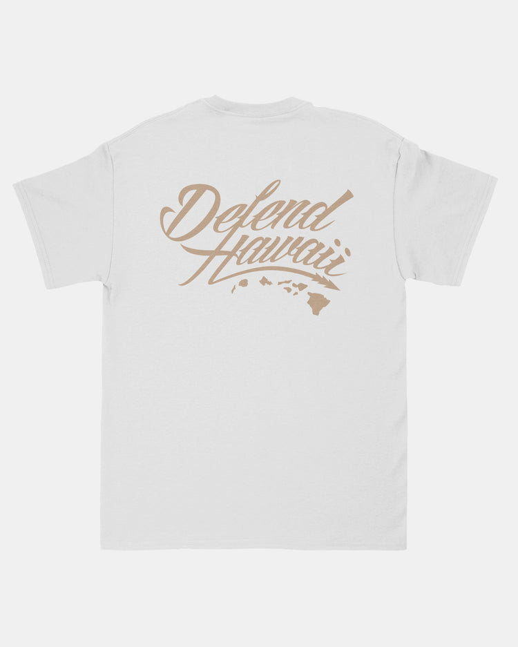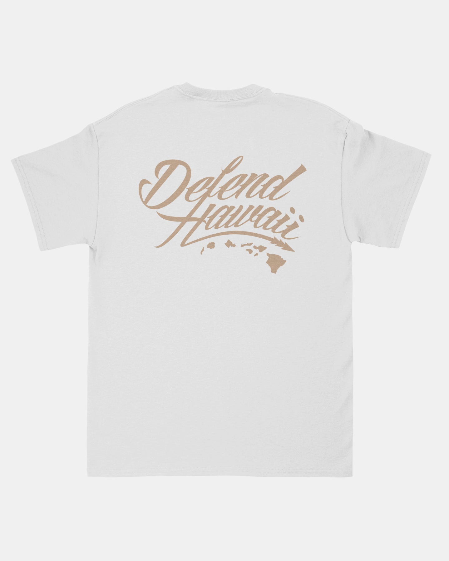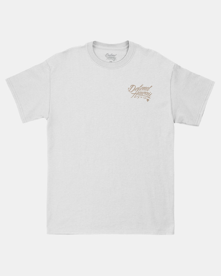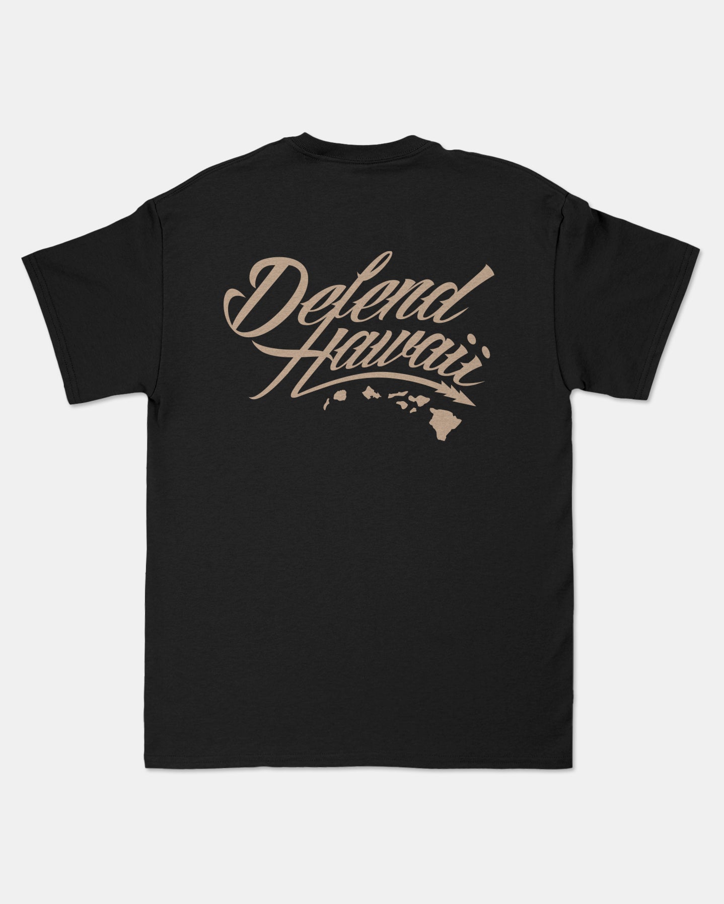 Defend Hawai'i - The iconic, never duplicated, stapled Wildstyle 'Elua logo. Featuring a subtle pocket hit paired with a mayjah back hit in a clean, simple color. Pick your favorite color way, this one comes in tan ink on a black or white casual fit t-shirt. Your everyday tee to DEFEND with.