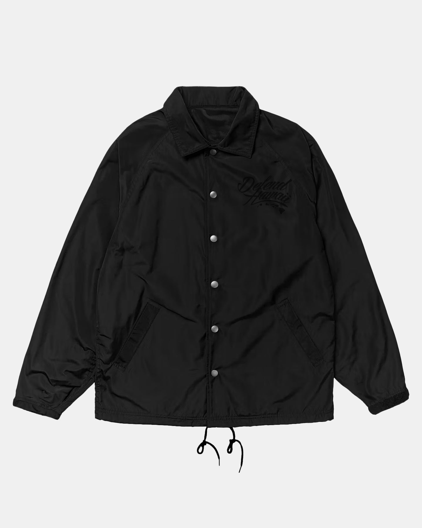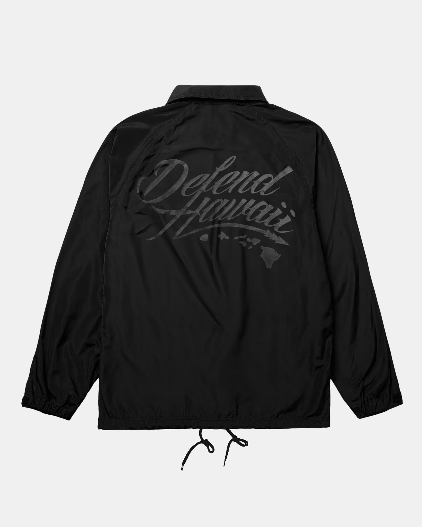 Defend Hawai'i - The iconic, never duplicated, stapled Wildstyle 'Elua logo. Featuring a subtle pocket hit paired with a mayjah back hit, this time puffed to perfection. This one comes in black puff ink on a black water repellent coaches jacket. Your everyday tee to DEFEND with.