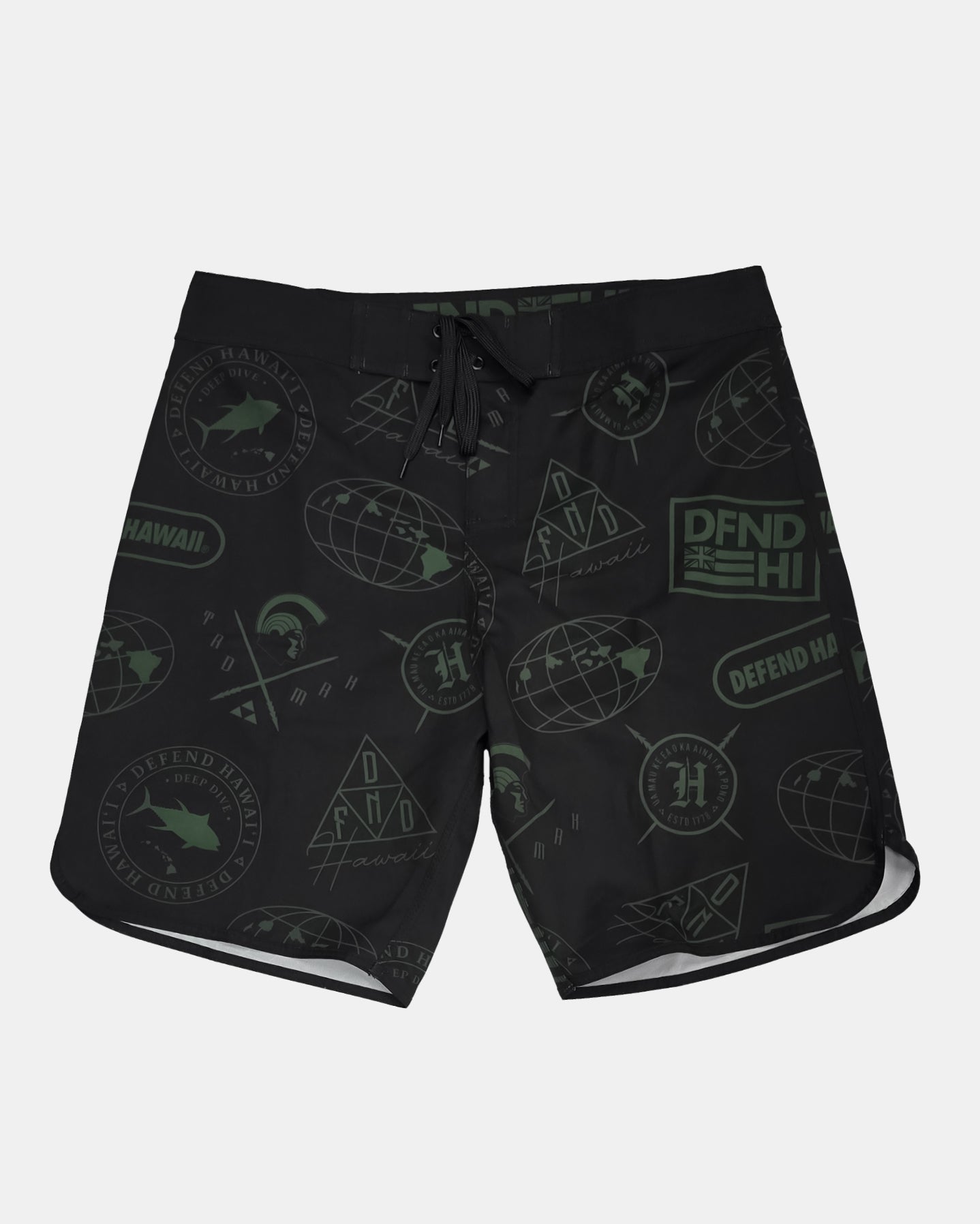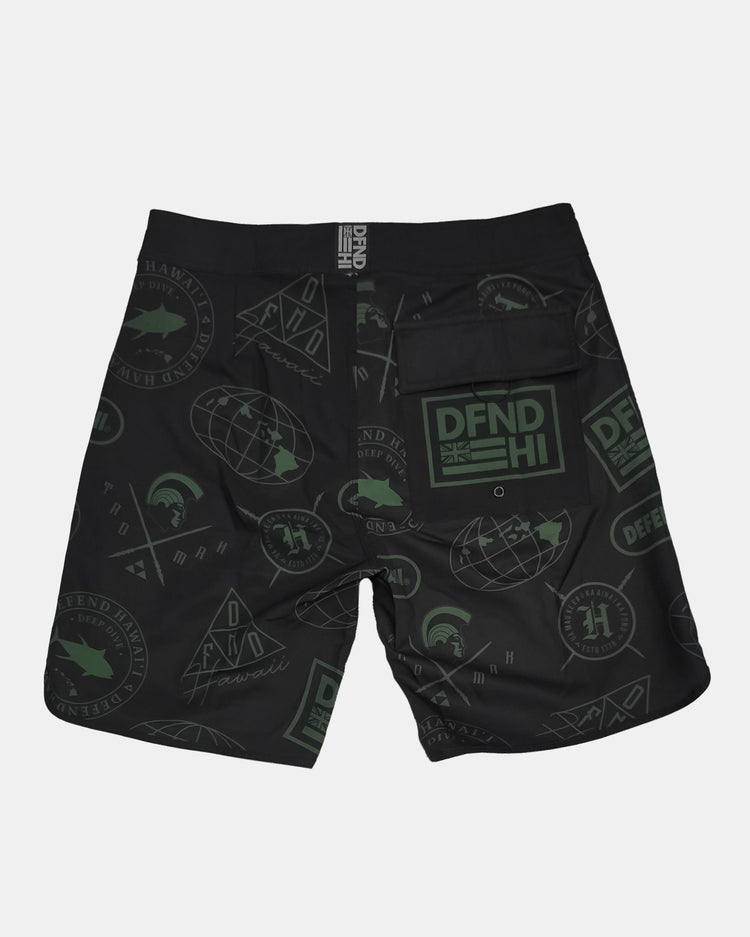 Defend Hawai'i -A branded boardshort, recognized Worldwide. Your favorite of our logos printed subtly in green on black.