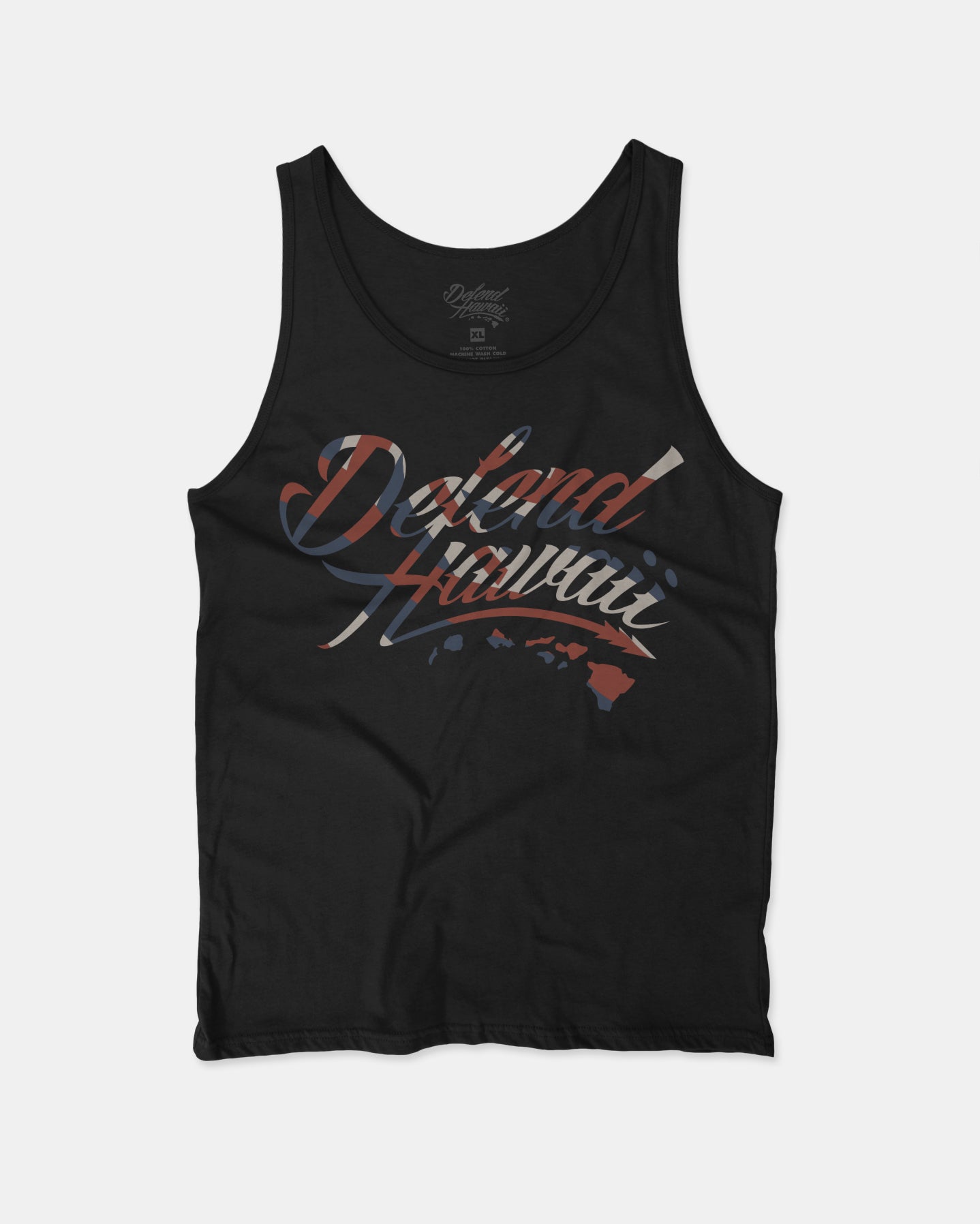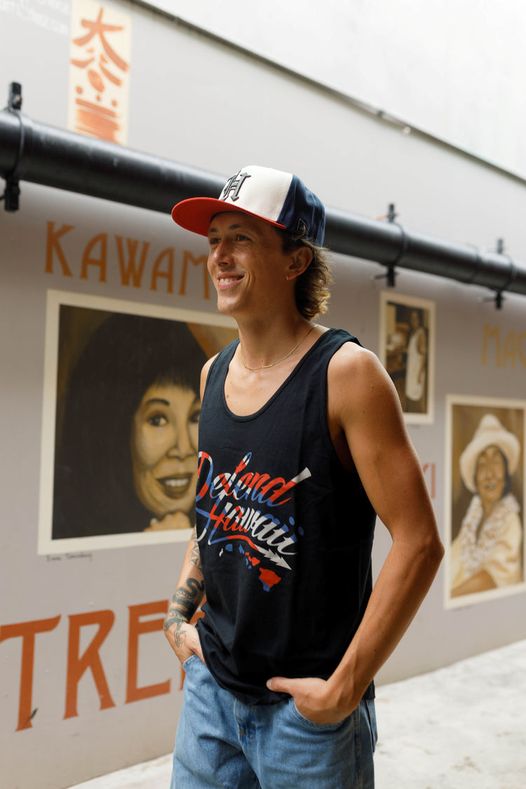 Defend Hawai'i - The iconic, never duplicated, stapled Wildstyle Logo. This time with red, white, and blue flying HAE, this is WS Hawaiiana. Pick your favorite color way, this one is available in red, white, and blue ink on a black casual fit tank. Your everyday tee to DEFEND with.