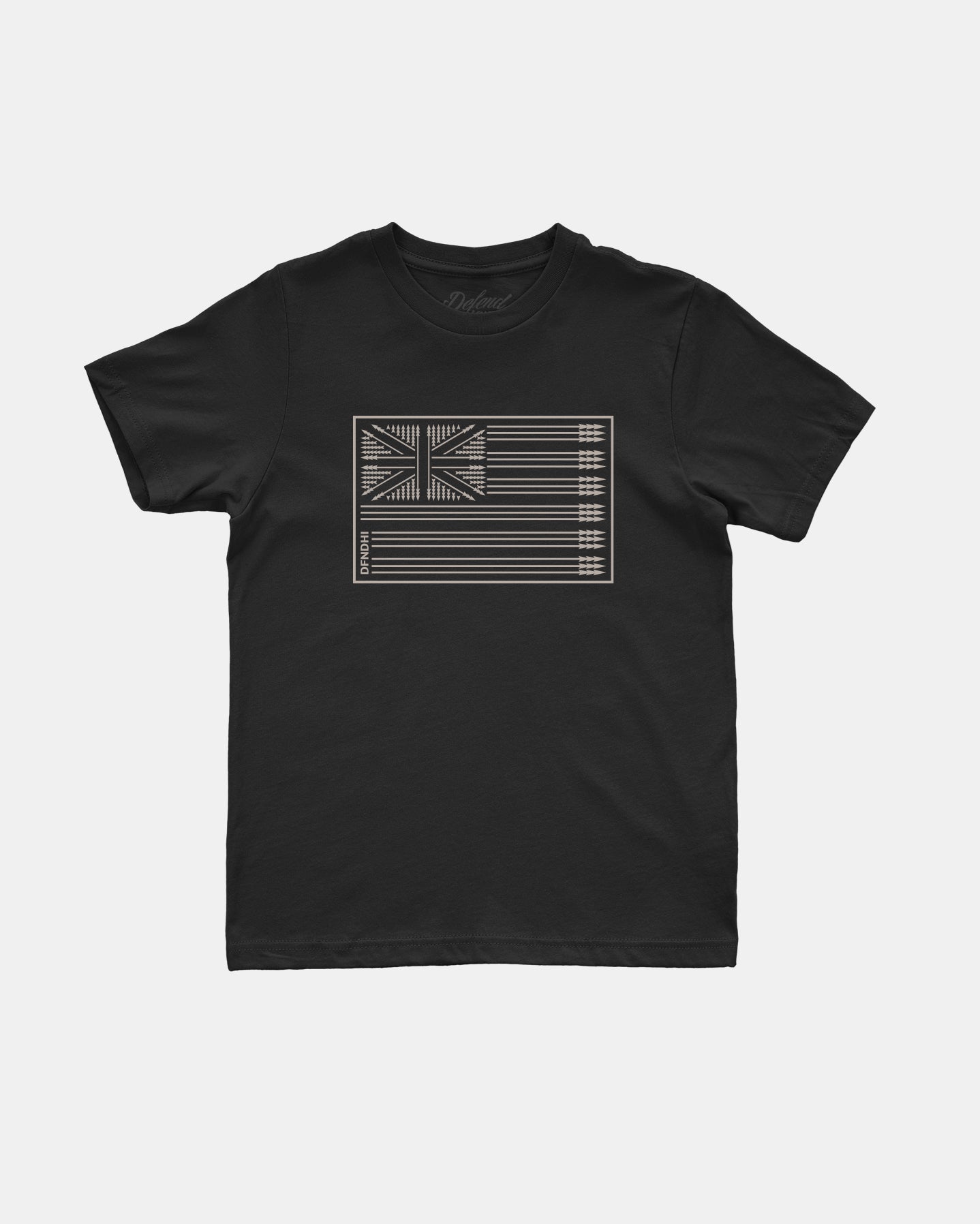 Defend Hawai'i - Our rendition of an icon, this one is Hae Spears, for da keiki. The look is in the name. Pick your favorite color way. This one comes in tan ink on a black or olive casual fit youth tee. Start 'um young, keiki defenders!