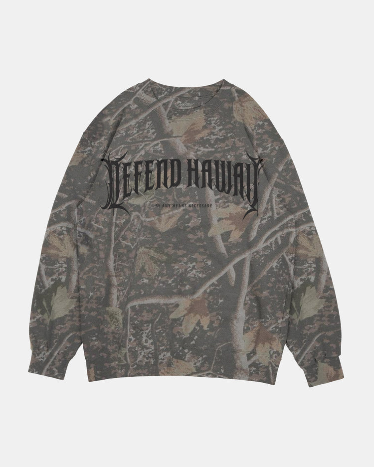 Defend Hawai'i - Representing our earthly struggles, this is Thorns. Featuring a sharp center chest hit. Pick your favorite color way, this one comes in black on wood camo midweight fleece crewneck.