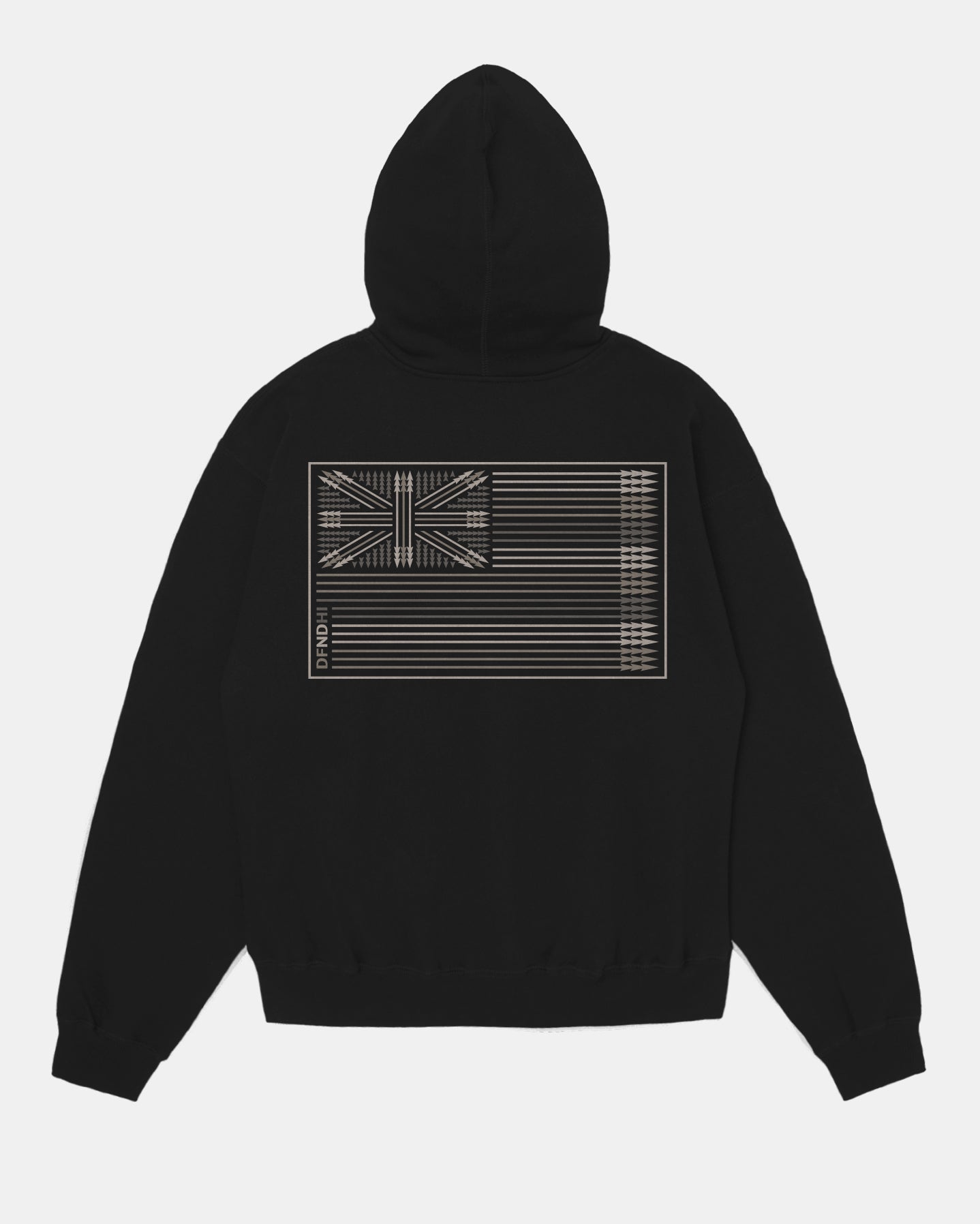 Defend Hawai'i - Our rendition of an icon, this one is Hae Spears. The look is in the name. Featuring a sharp pocket hit and matching back hit. Pick your favorite color way, this one comes in tan ink on a black midweight fleece pullover hoodie.