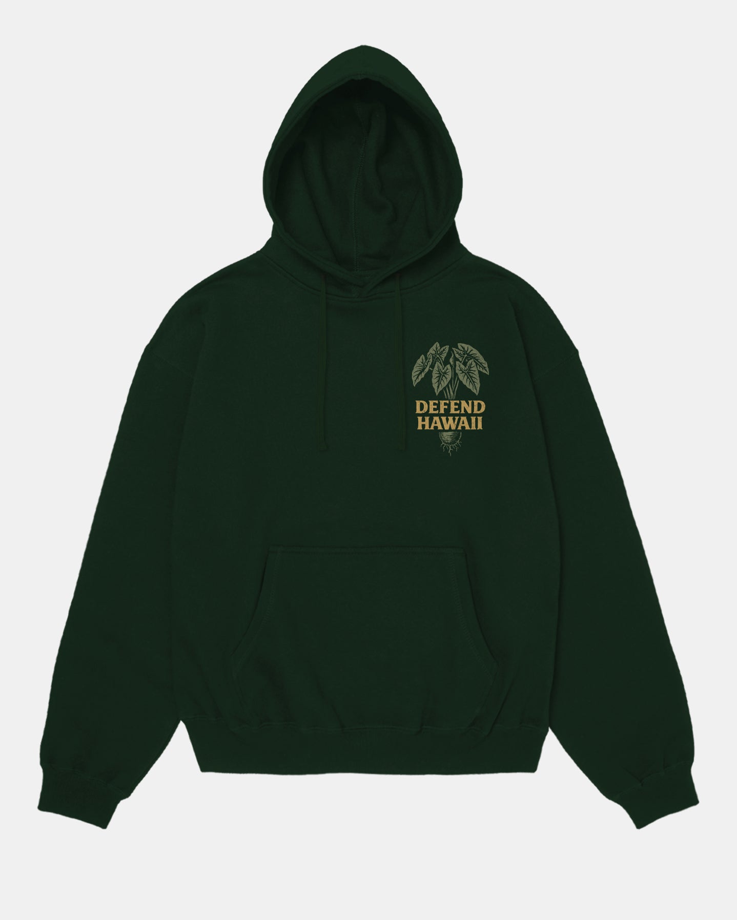 Defend Hawai'i - There are a lot of ways to Defend Hawai'i, but the new Kū Kia'i 'Āina design is for those who like to start at the roots. It's aloha 'āina always. Perfect in or out of the lo'i. Pick your favorite color way. This comes in yellow and green ink on a forest green midweight fleece pullover hoodie.