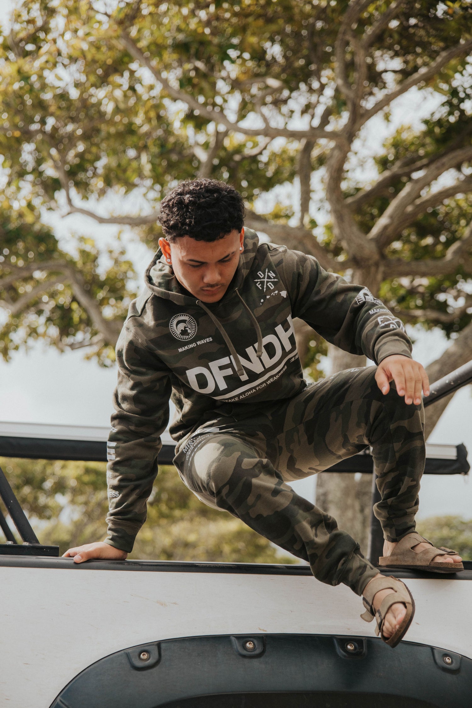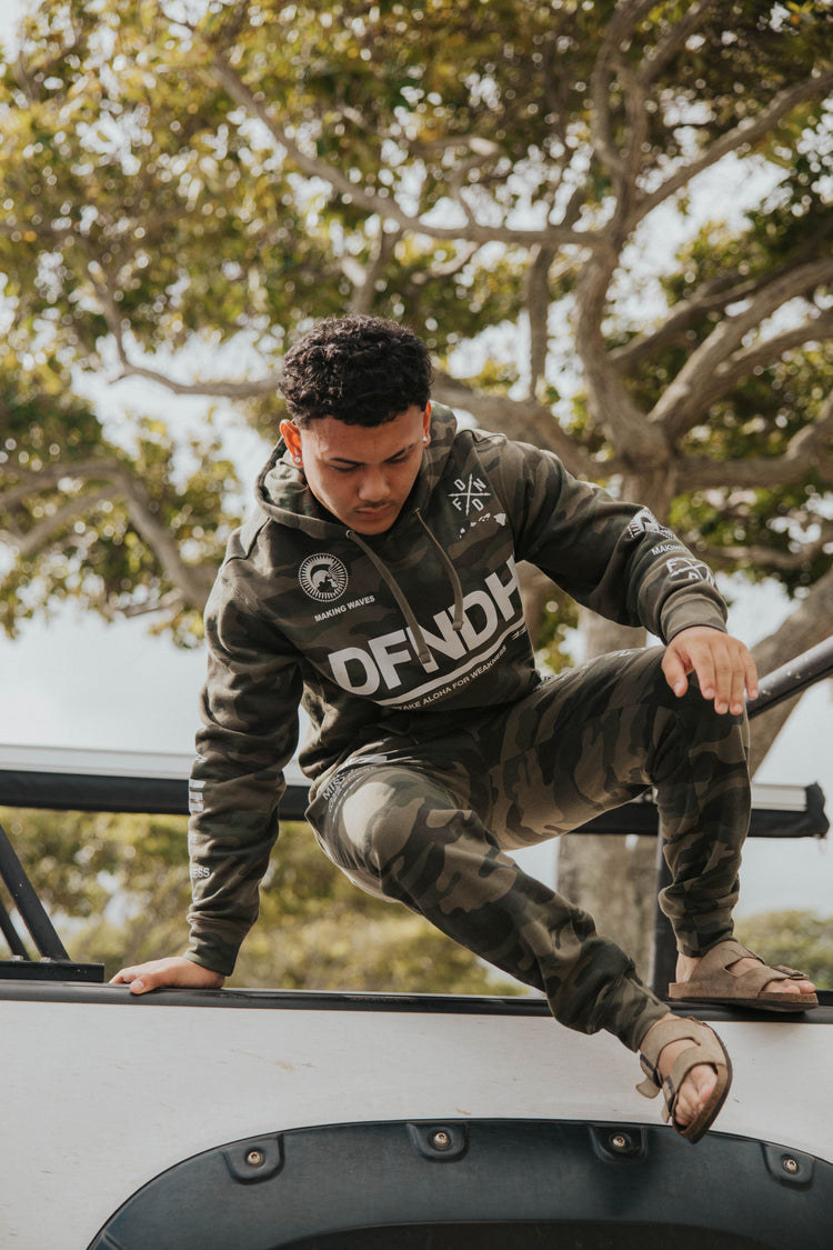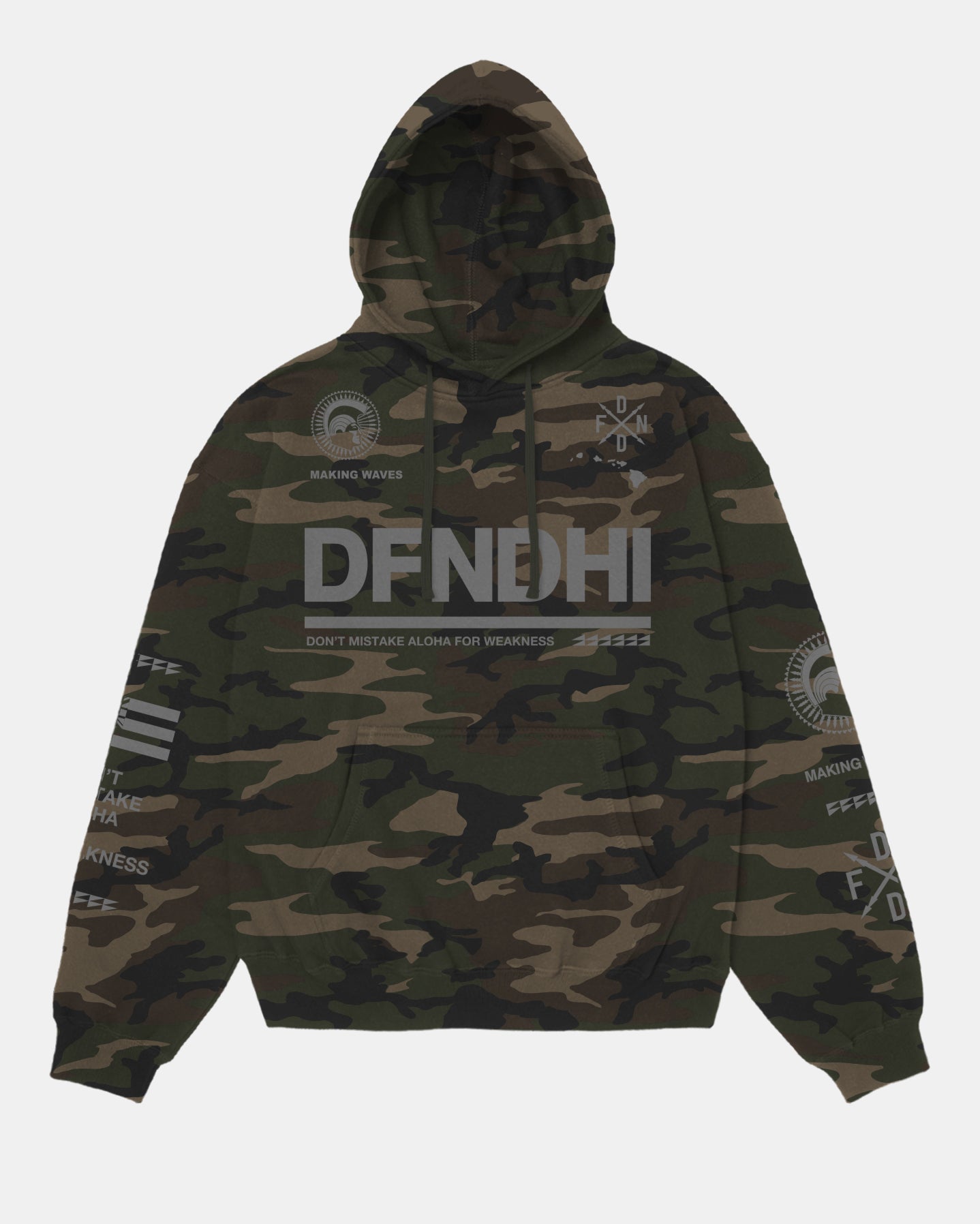 Defend Hawai'i - One of our classic heavy hitter designs remastered as the new Making Waves '26. Featuring the og mayjah front hit and doublle sleeve hits. Pick your favorite color way, this one comes in light gray ink on a wood camo midweight fleece pullover hoodie.