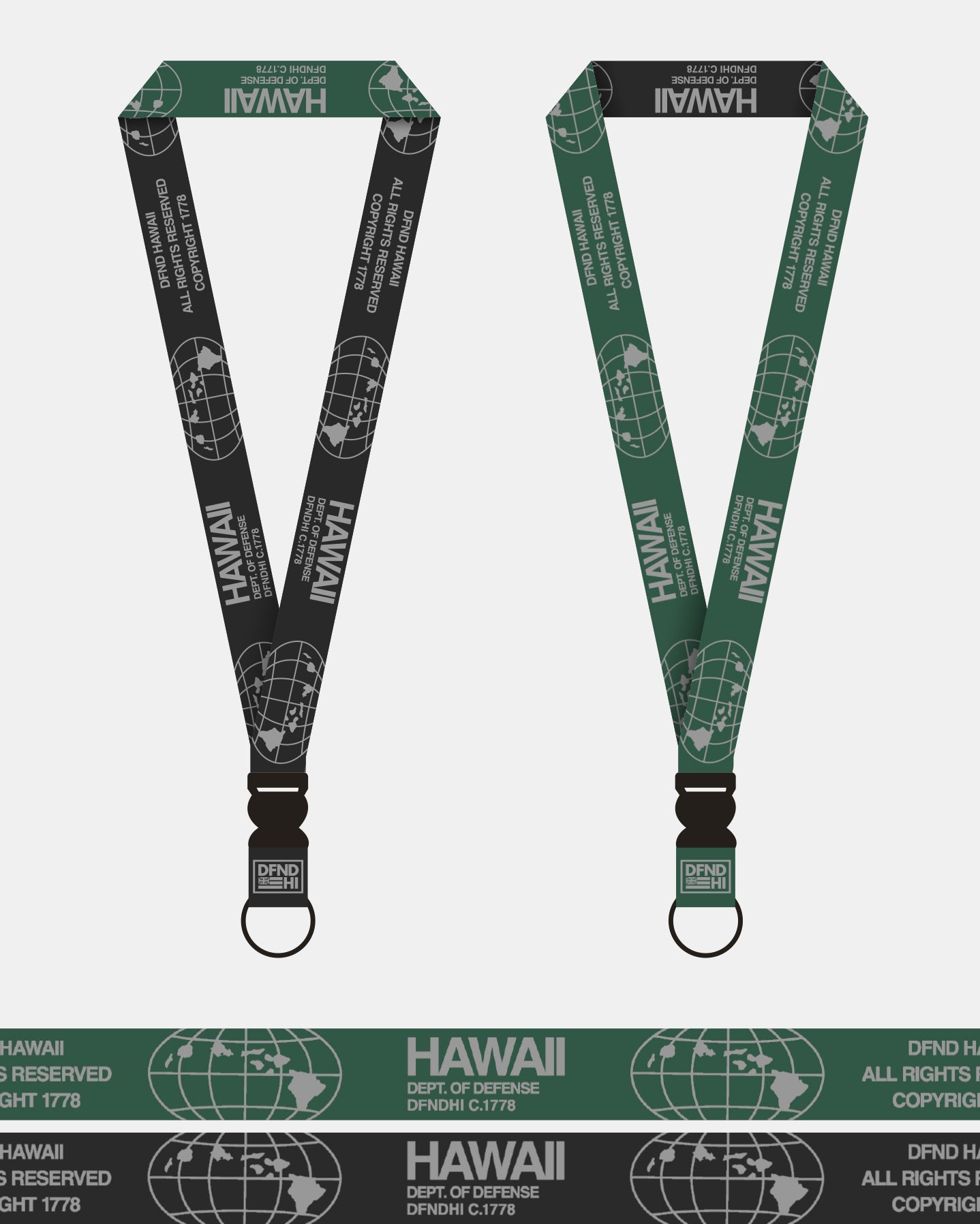 Defend Hawai'i accessories. One of our most popular products and an easy gift for anyone, a Defend Hawai'i lanyard. Worldwide lanyard in green, black, and gray.