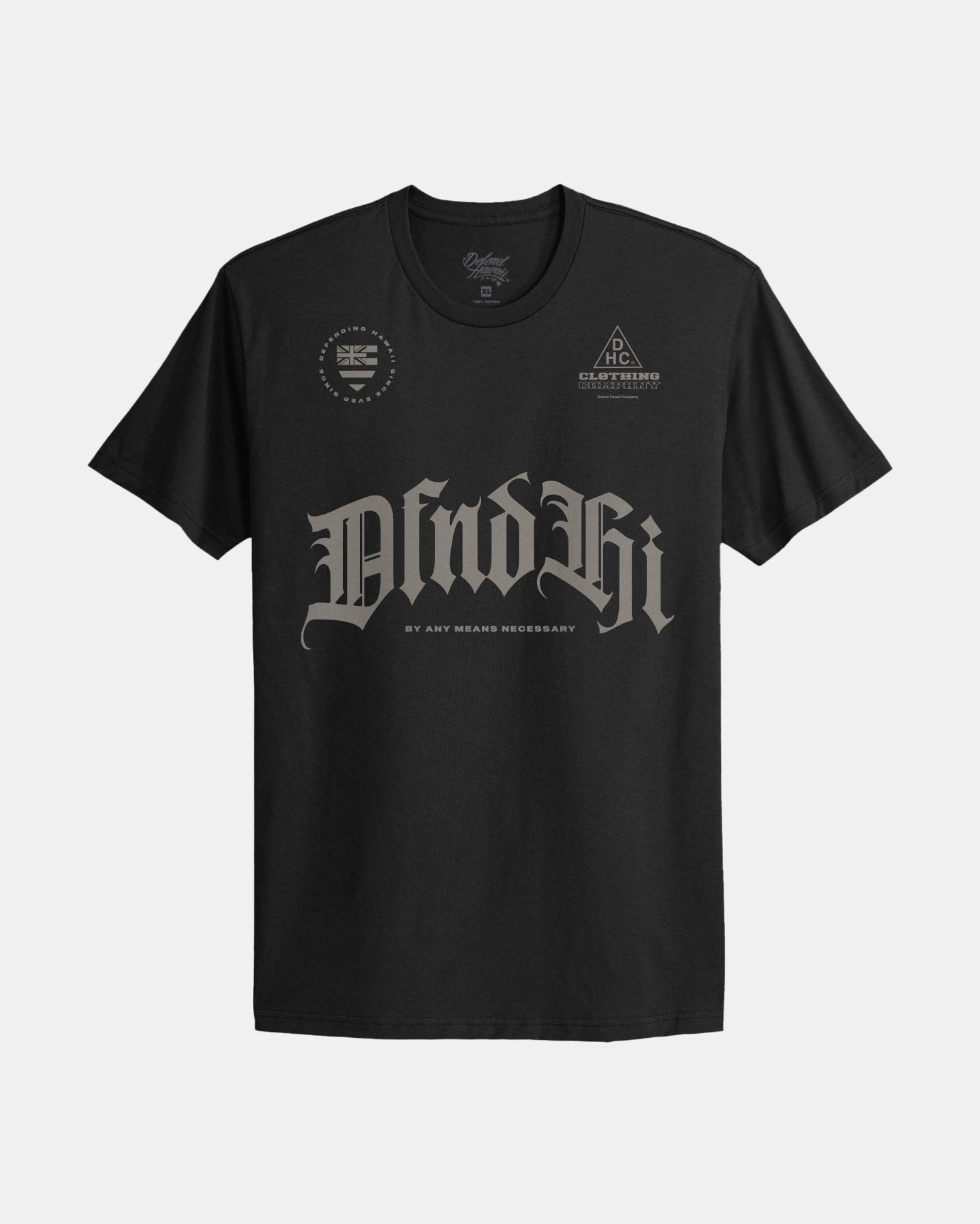 Defend Hawai'i - For the juniors and the OG's, get ready for the Kanak Attack. Featuring a couple shoulder hits and DFND Hi, straight across the ʻōpū. Don't miss the lower back hit. By Any Means Necessary. Pick your favorite color way. This comes in slate ink on a black premium-fit tee.
